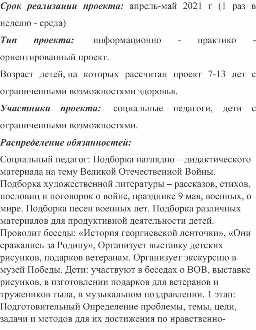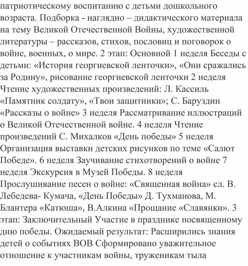 Социальный педагог: Подборка наглядно – дидактического материала на тему Великой Отечественной Войны. Подборка художественной литературы – рассказов, стихов, пословиц и поговорок о войне, празднике 9 мая, военных, о мире. Подборка песен военных лет. Подборка различных материалов для продуктивной деятельности детей. Проводит беседы: «История георгиевской ленточки», «Они сражались за Родину», Организует выставку детских рисунков, подарков ветеранам. Организует экскурсию в музей Победы. Дети: участвуют в беседах о ВОВ, выставке рисунков, в изготовлении подарков для ветеранов и тружеников тыла, в музыкальном поздравлении. 1 этап: Подготовительный Определение проблемы, темы, цели, задачи и методов для их достижения по нравственно-патриотическому воспитанию с детьми дошкольного возраста. Подборка - наглядно – дидактического материала на тему Великой Отечественной Войны, художественной литературы – рассказов, стихов, пословиц и поговорок о войне, военных, о мире. 2 этап: Основной 1 неделя Беседы с детьми: «История георгиевской ленточки», «Они сражались за Родину», рисование георгиевской ленточки 2 неделя Чтение художественных произведений: Л. Кассиль «Памятник солдату», «Твои защитники»; С. Баруздин «Рассказы о войне» 3 неделя Рассматривание иллюстраций о Великой Отечественной войне. 4 неделя Чтение произведений С. Михалков «День победы» 5 неделя Организация выставки детских рисунков по теме «Салют Победе». 6 неделя Заучивание стихотворений о войне 7 неделя Экскурсия в Музей Победы. 8 неделя Прослушивание песен о войне: «Священная война» сл. В. Лебедева- Кумача, «День Победы» Д. Тухманова, М. Блантера «Катюша», В.Алкина «Прощание «Славянки». 3 этап: Заключительный Участие в празднике посвященному дню победы. Ожидаемый результат: Расширились знания детей о событиях ВОВ Сформировано уважительное отношение к участникам войны, труженикам тыла