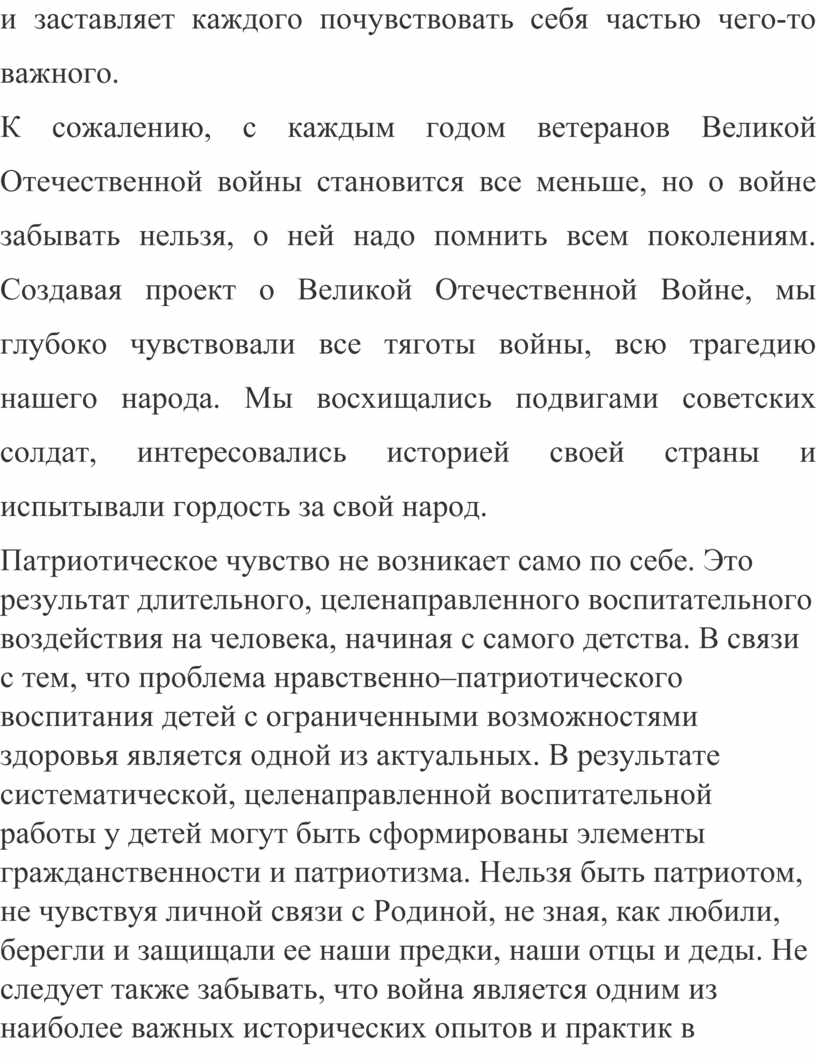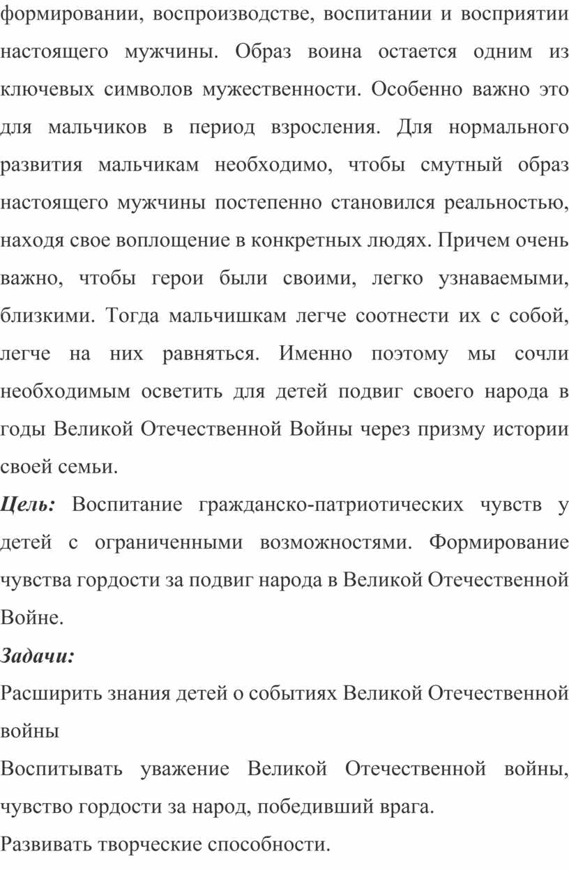 Патриотическое чувство не возникает само по себе. Это результат длительного, целенаправленного воспитательного воздействия на человека, начиная с самого детства. В связи с тем, что проблема нравственно–патриотического воспитания детей с ограниченными возможностями здоровья является одной из актуальных. В результате систематической, целенаправленной воспитательной работы у детей могут быть сформированы элементы гражданственности и патриотизма. Нельзя быть патриотом, не чувствуя личной связи с Родиной, не зная, как любили, берегли и защищали ее наши предки, наши отцы и деды. Не следует также забывать, что война является одним из наиболее важных исторических опытов и практик в формировании, воспроизводстве, воспитании и восприятии настоящего мужчины. Образ воина остается одним из ключевых символов мужественности. Особенно важно это для мальчиков в период взросления. Для нормального развития мальчикам необходимо, чтобы смутный образ настоящего мужчины постепенно становился реальностью, находя свое воплощение в конкретных людях. Причем очень важно, чтобы герои были своими, легко узнаваемыми, близкими. Тогда мальчишкам легче соотнести их с собой, легче на них равняться. Именно поэтому мы сочли необходимым осветить для детей подвиг своего народа в годы Великой Отечественной Войны через призму истории своей семьи.