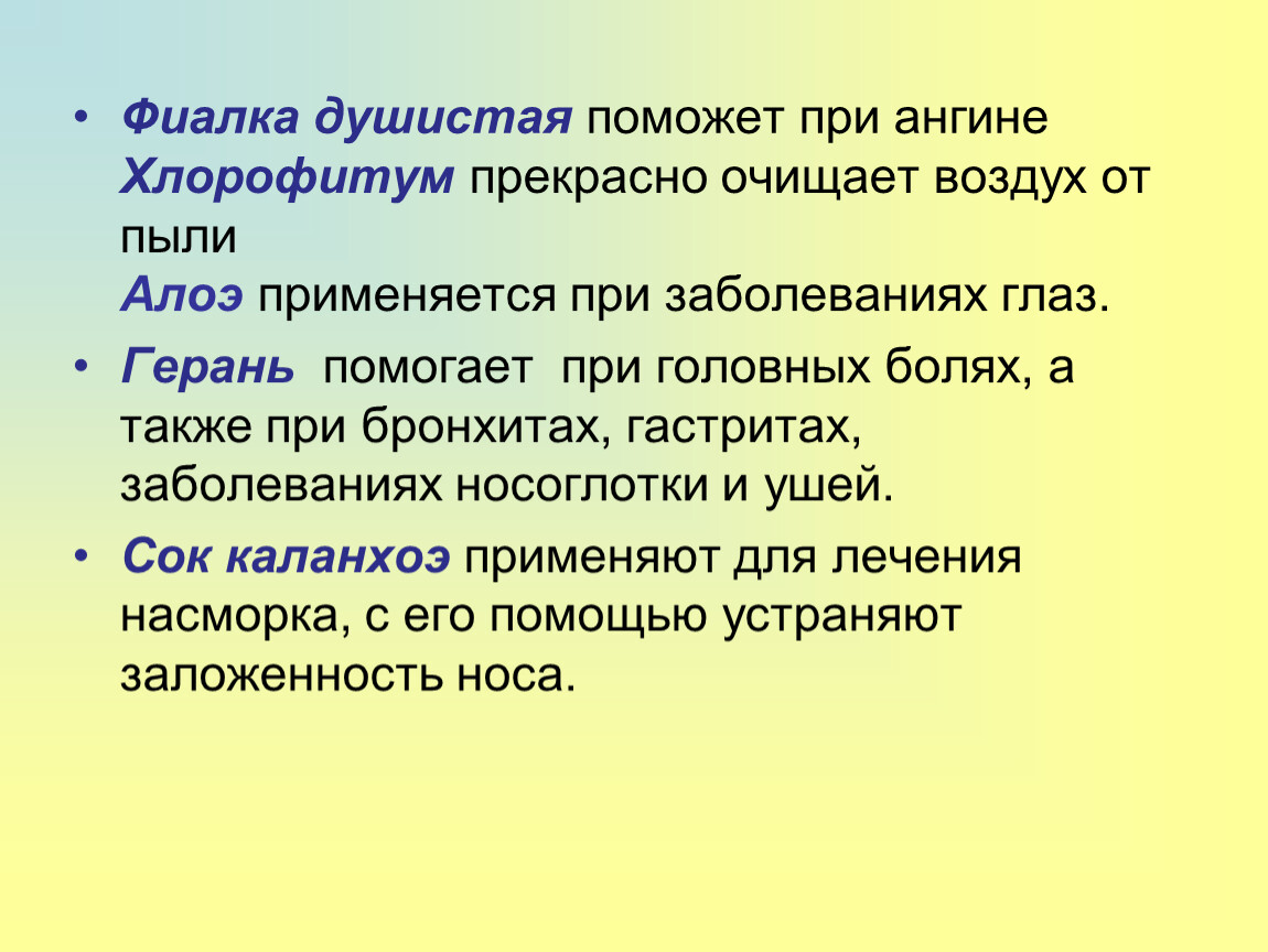 Фиалка душистая поможет при ангинеХлорофитум прекрасно очищает воздух от пылиАлоэ применяется при заболеваниях глаз.