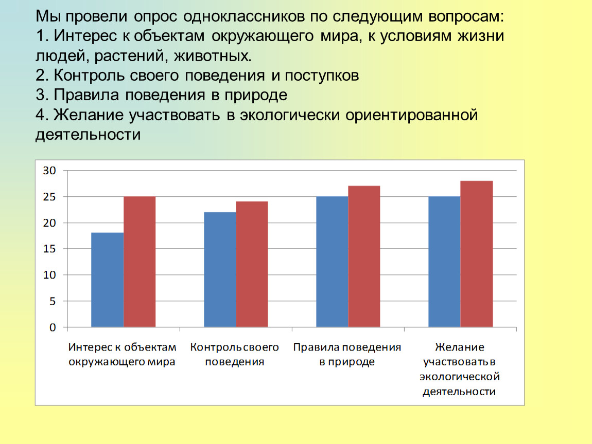 Мы провели опрос одноклассников по следующим вопросам: 1. Интерес к объектам окружающего мира, к условиям жизни людей, растений, животных. 2. Контроль своего поведения и поступков 3. Правила поведения в природе 4. Желание участвовать в экологически ориентированной деятельности