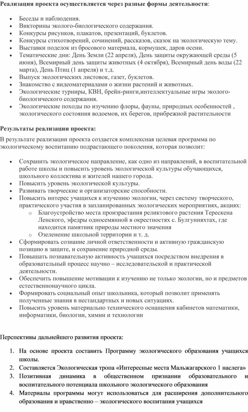 В результате реализации проекта создается комплексная целевая программа по экологическому воспитанию подрастающего поколения, которая позволит: