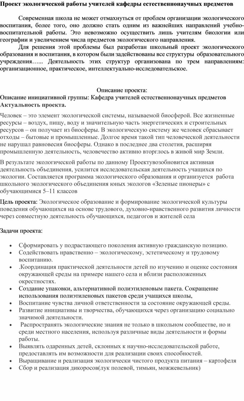 Проект экологической работы учителей кафедры естественнонаучных предметов