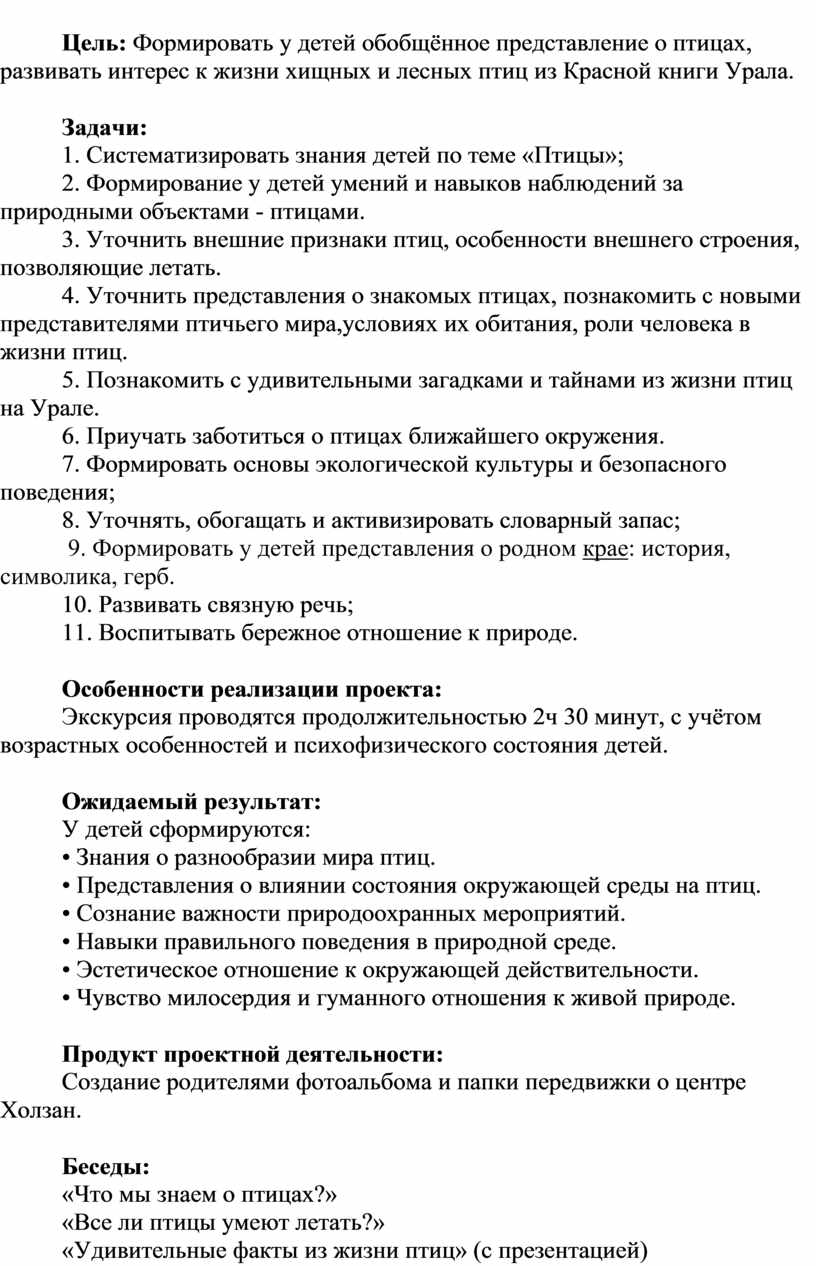 Цель: Формировать у детей обобщённое представление о птицах, развивать интерес к жизни хищных и лесных птиц из Красной книги Урала.
