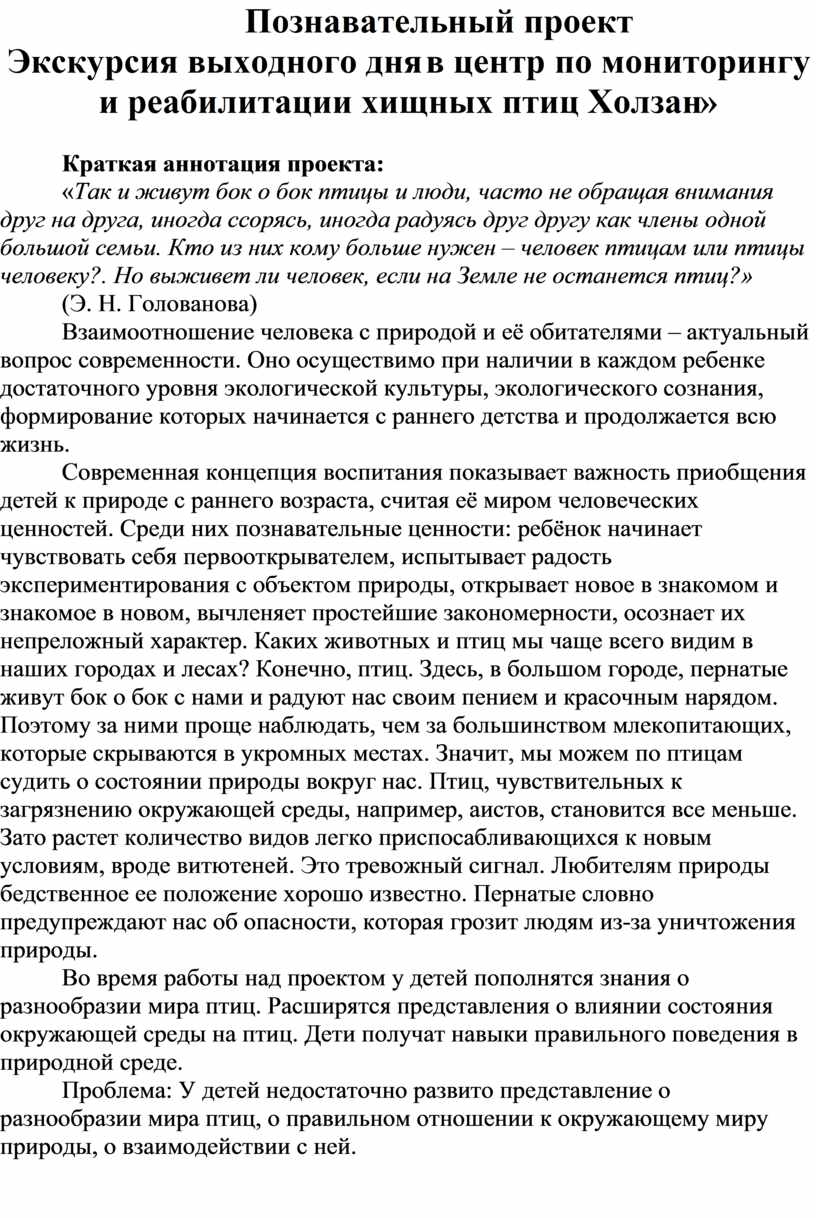 Современная концепция воспитания показывает важность приобщения детей к природе с раннего возраста, считая её миром человеческих ценностей. Среди них познавательные ценности: ребёнок начинает чувствовать себя первооткрывателем, испытывает радость экспериментирования с объектом природы, открывает новое в знакомом и знакомое в новом, вычленяет простейшие закономерности, осознает их непреложный характер. Каких животных и птиц мы чаще всего видим в наших городах и лесах? Конечно, птиц. Здесь, в большом городе, пернатые живут бок о бок с нами и радуют нас своим пением и красочным нарядом. Поэтому за ними проще наблюдать, чем за большинством млекопитающих, которые скрываются в укромных местах. Значит, мы можем по птицам судить о состоянии природы вокруг нас. Птиц, чувствительных к загрязнению окружающей среды, например, аистов, становится все меньше. Зато растет количество видов легко приспосабливающихся к новым условиям, вроде витютеней. Это тревожный сигнал. Любителям природы бедственное ее положение хорошо известно. Пернатые словно предупреждают нас об опасности, которая грозит людям из-за уничтожения природы.