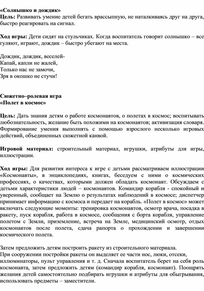 иллюминаторы, пульт управления и т. д. Сначала воспитатель берет на себя роль космонавта, затем предложить детям (командир корабля, космонавт). Поощрять желания детей самостоятельно подбирать игрушки и атрибуты для обыгрывания, использовать предметы – заместители.