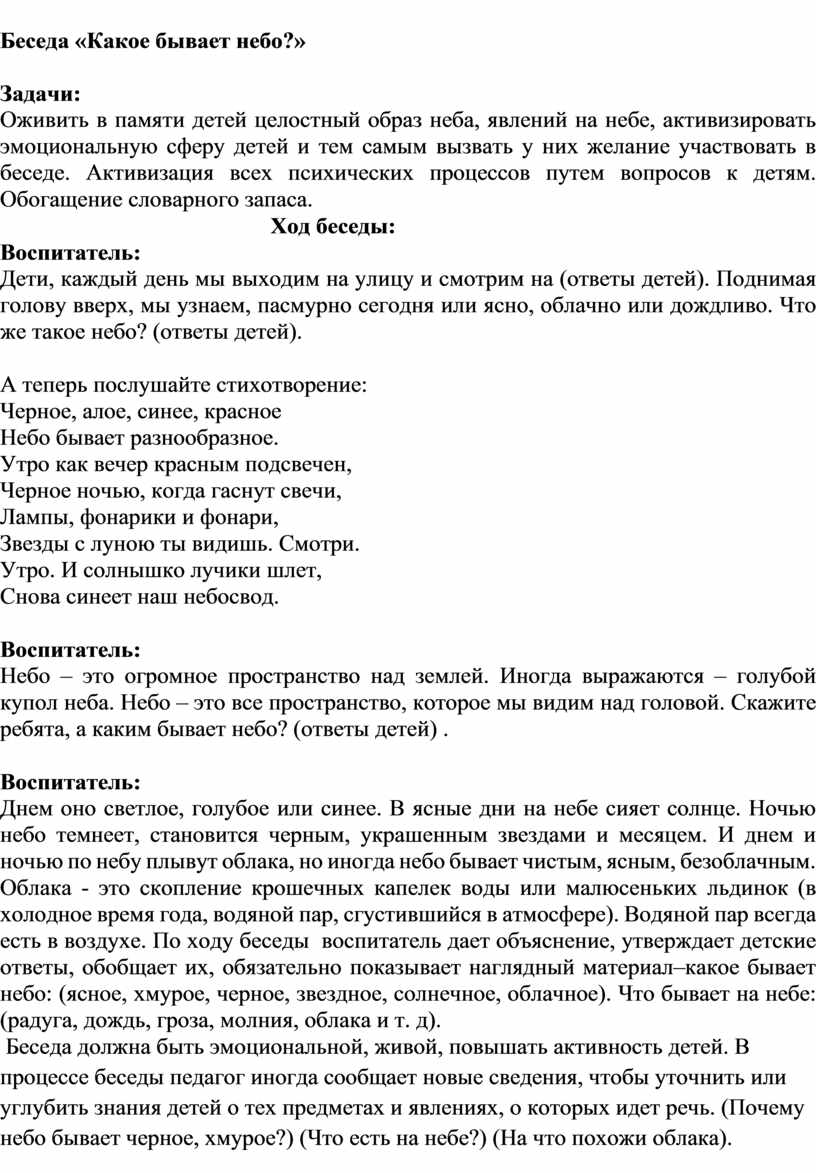 Днем оно светлое, голубое или синее. В ясные дни на небе сияет солнце. Ночью небо темнеет, становится черным, украшенным звездами и месяцем. И днем и ночью по небу плывут облака, но иногда небо бывает чистым, ясным, безоблачным. Облака - это скопление крошечных капелек воды или малюсеньких льдинок (в холодное время года, водяной пар, сгустившийся в атмосфере). Водяной пар всегда есть в воздухе. По ходу беседы воспитатель дает объяснение, утверждает детские ответы, обобщает их, обязательно показывает наглядный материал–какое бывает небо: (ясное, хмурое, черное, звездное, солнечное, облачное). Что бывает на небе: (радуга, дождь, гроза, молния, облака и т. д).