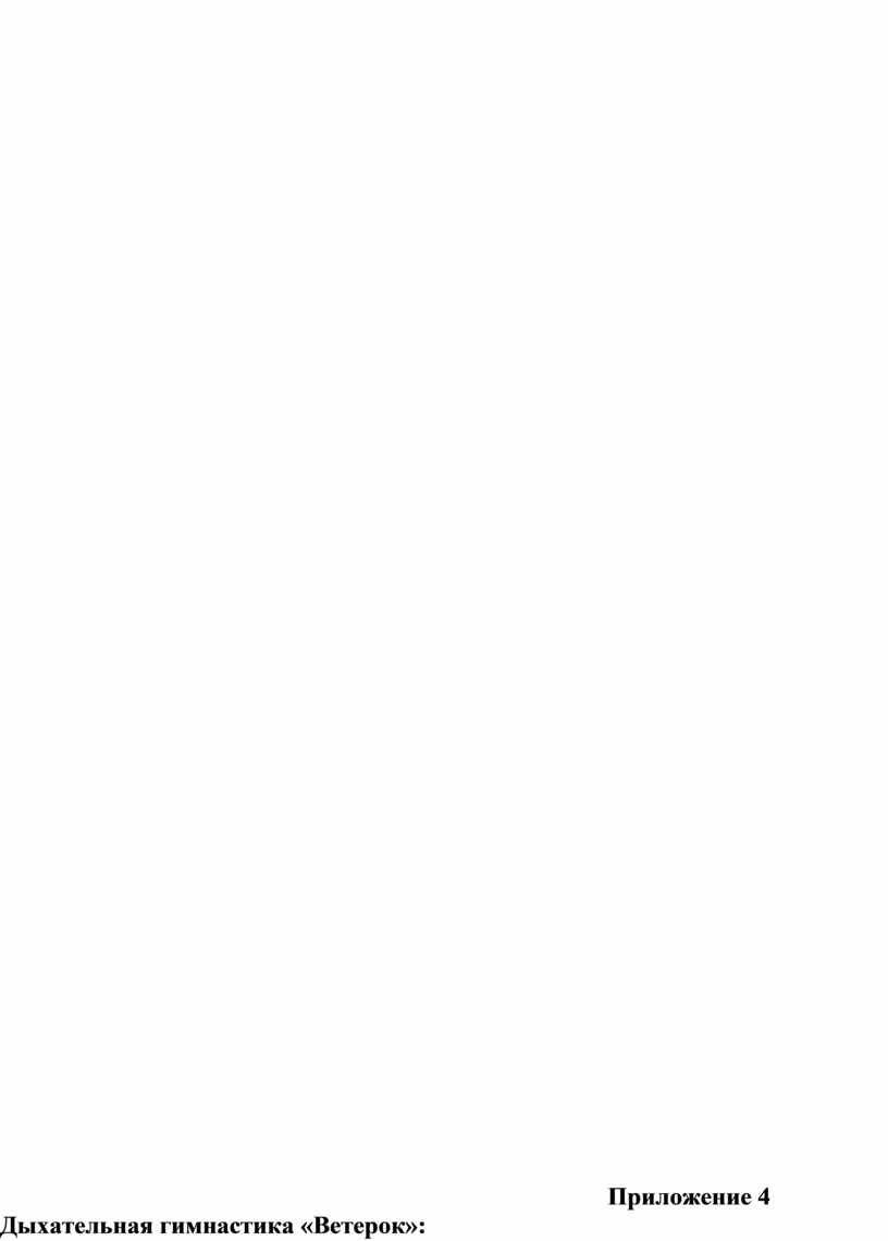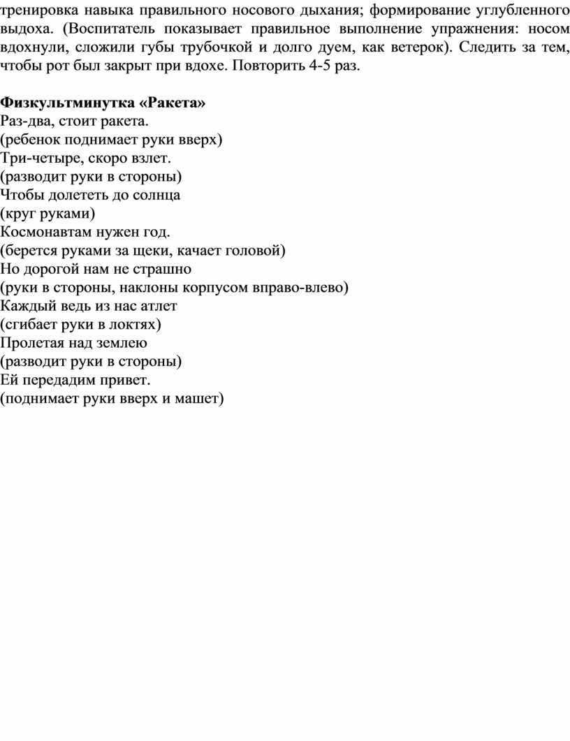 тренировка навыка правильного носового дыхания; формирование углубленного выдоха. (Воспитатель показывает правильное выполнение упражнения: носом вдохнули, сложили губы трубочкой и долго дуем, как ветерок). Следить за тем, чтобы рот был закрыт при вдохе. Повторить 4-5 раз.