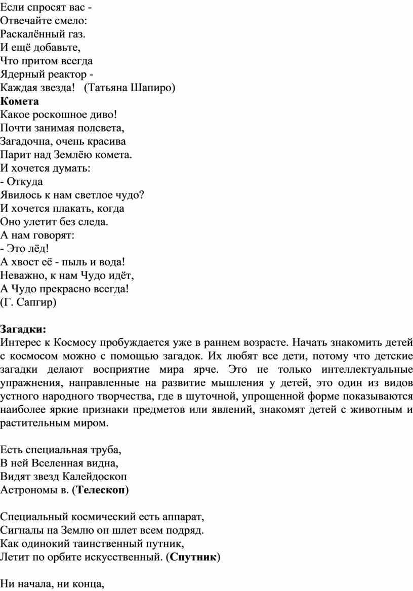 Интерес к Космосу пробуждается уже в раннем возрасте. Начать знакомить детей с космосом можно с помощью загадок. Их любят все дети, потому что детские загадки делают восприятие мира ярче. Это не только интеллектуальные упражнения, направленные на развитие мышления у детей, это один из видов устного народного творчества, где в шуточной, упрощенной форме показываются наиболее яркие признаки предметов или явлений, знакомят детей с животным и растительным миром.