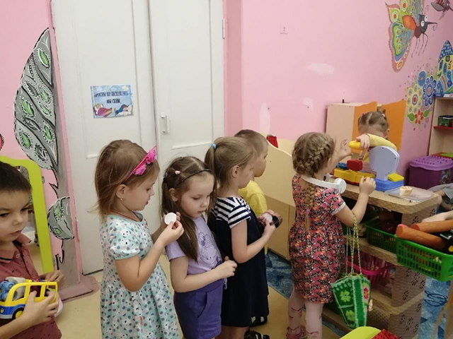 Дети берут на себя роли покупателей и продавцов, обсуждают, что они хотят купить и сколько это стоит.