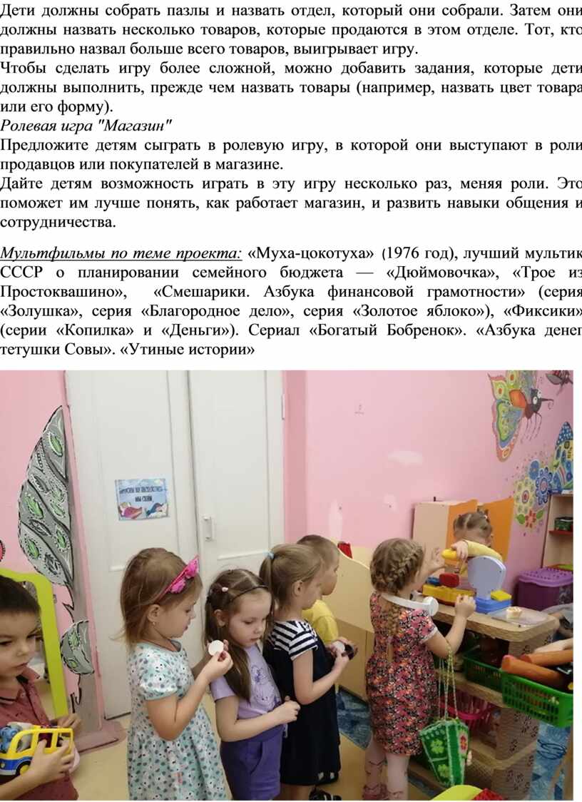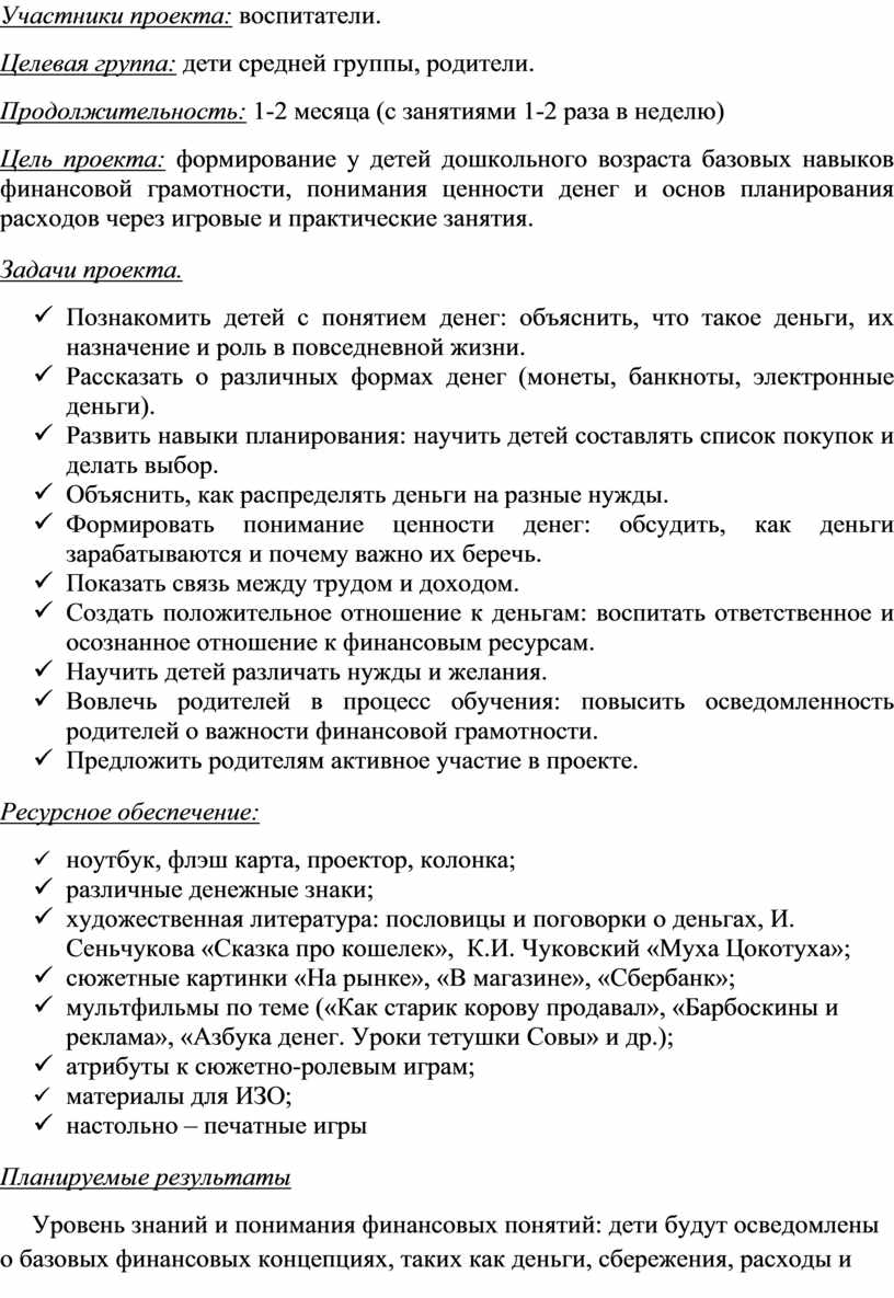 Цель проекта: формирование у детей дошкольного возраста базовых навыков финансовой грамотности, понимания ценности денег и основ планирования расходов через игровые и практические занятия.