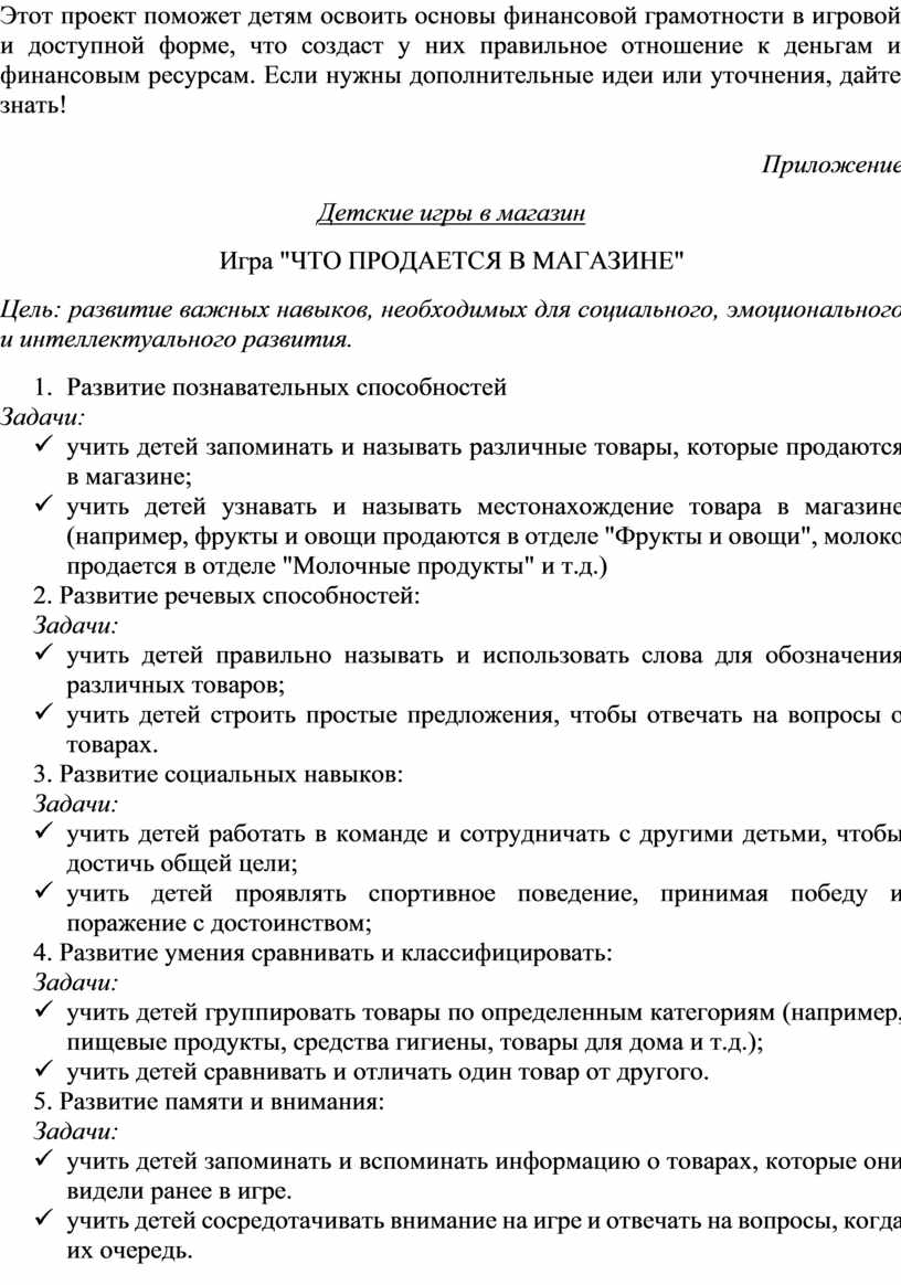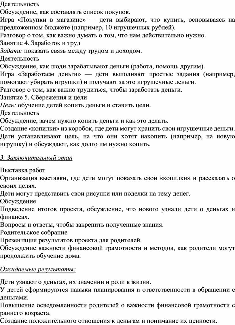 Этот проект поможет детям освоить основы финансовой грамотности в игровой и доступной форме, что создаст у них правильное отношение к деньгам и финансовым ресурсам. Если нужны дополнительные идеи или уточнения, дайте знать!