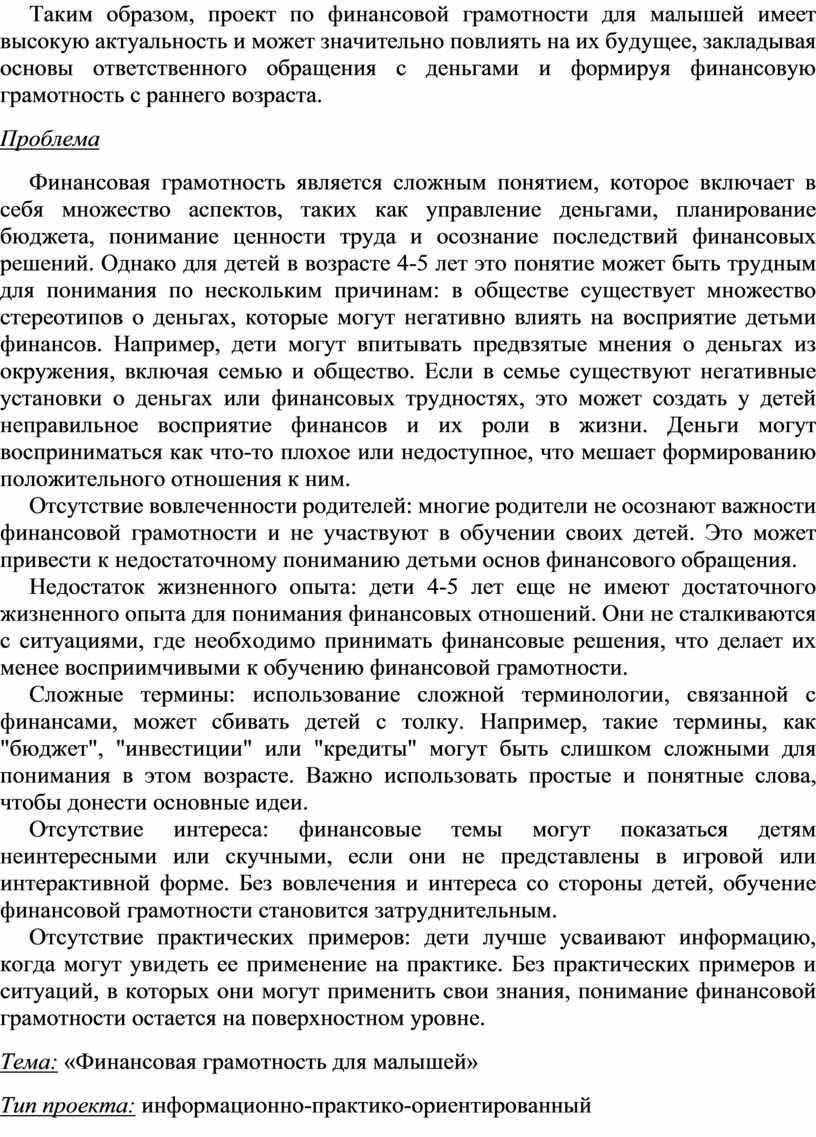 Таким образом, проект по финансовой грамотности для малышей имеет высокую актуальность и может значительно повлиять на их будущее, закладывая основы ответственного обращения с деньгами и формируя финансовую грамотность с раннего возраста.