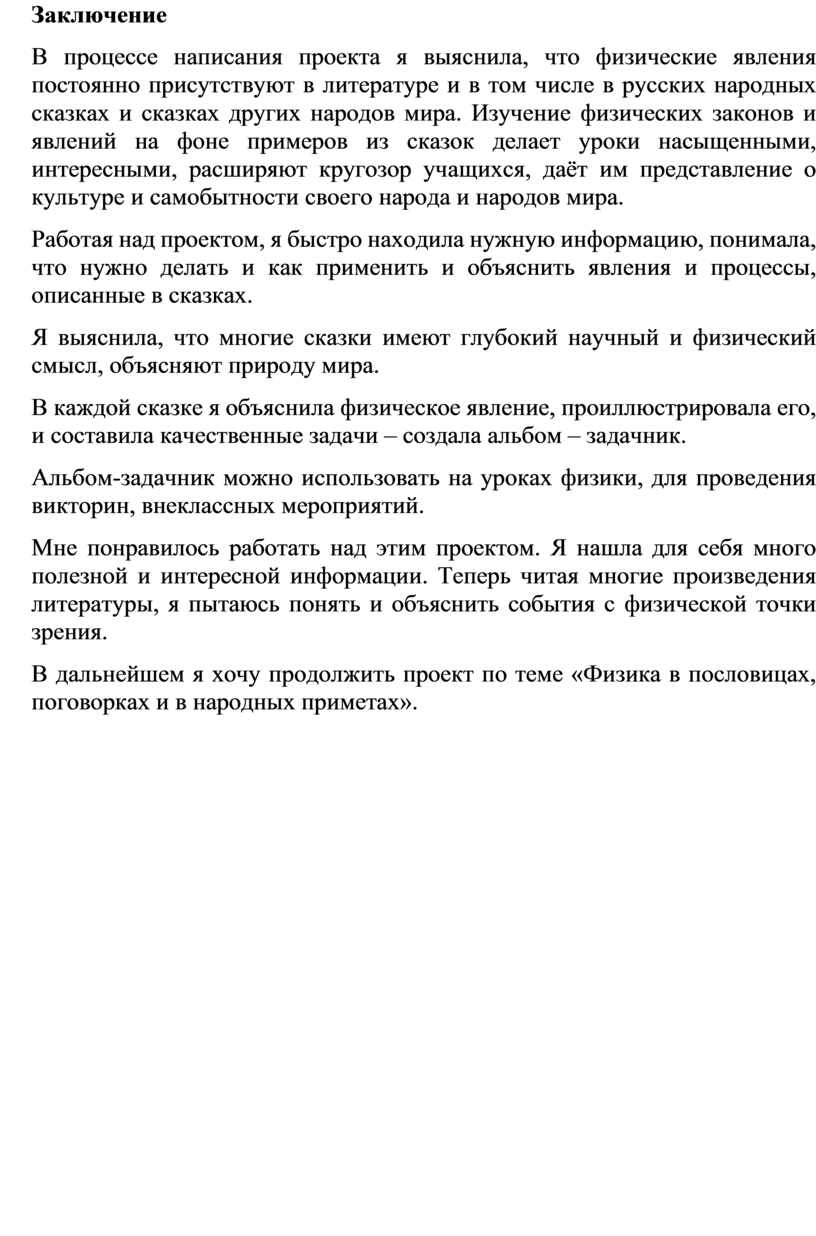 В процессе написания проекта я выяснила, что физические явления постоянно присутствуют в литературе и в том числе в русских народных сказках и сказках других народов мира. Изучение физических законов и явлений на фоне примеров из сказок делает уроки насыщенными, интересными, расширяют кругозор учащихся, даёт им представление о культуре и самобытности своего народа и народов мира.