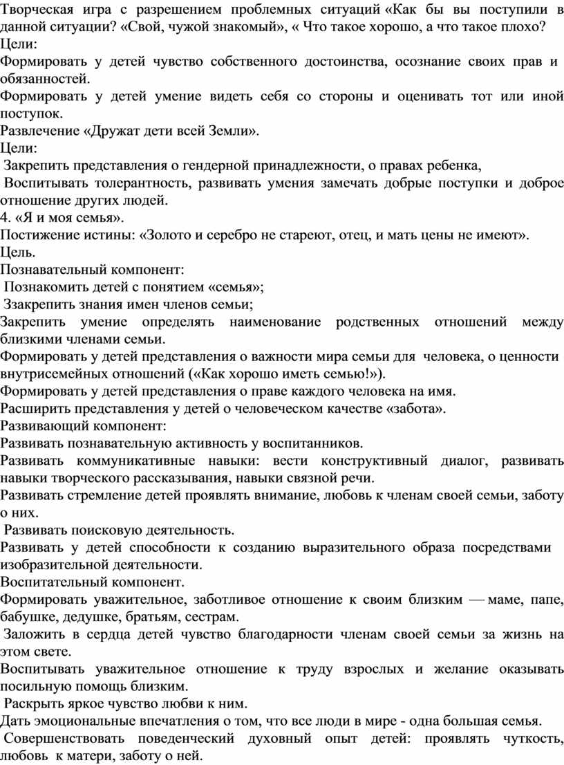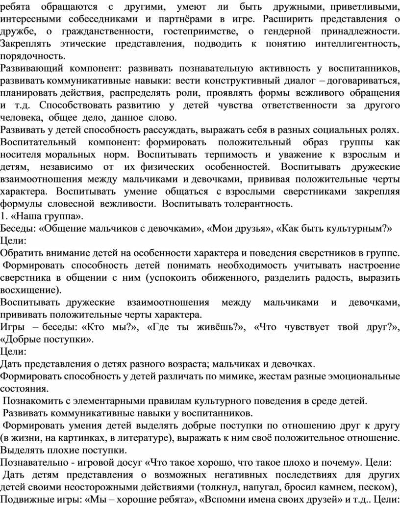 Познавательный компонент: познакомить воспитанников с основами соблюдения этикета, с нормами поведения с взрослыми и сверстниками; расширить представления о многообразии социальных ролей, о собственных правах и обязанностях. Объяснить детям, что дружеское отношение зависит от того, как ребята обращаются с другими, умеют ли быть дружными, приветливыми, интересными собеседниками и партнёрами в игре. Расширить представления о дружбе, о гражданственности, гостеприимстве, о гендерной принадлежности. Закреплять этические представления, подводить к понятию интеллигентность, порядочность.