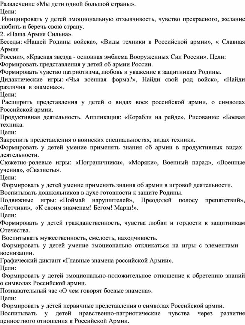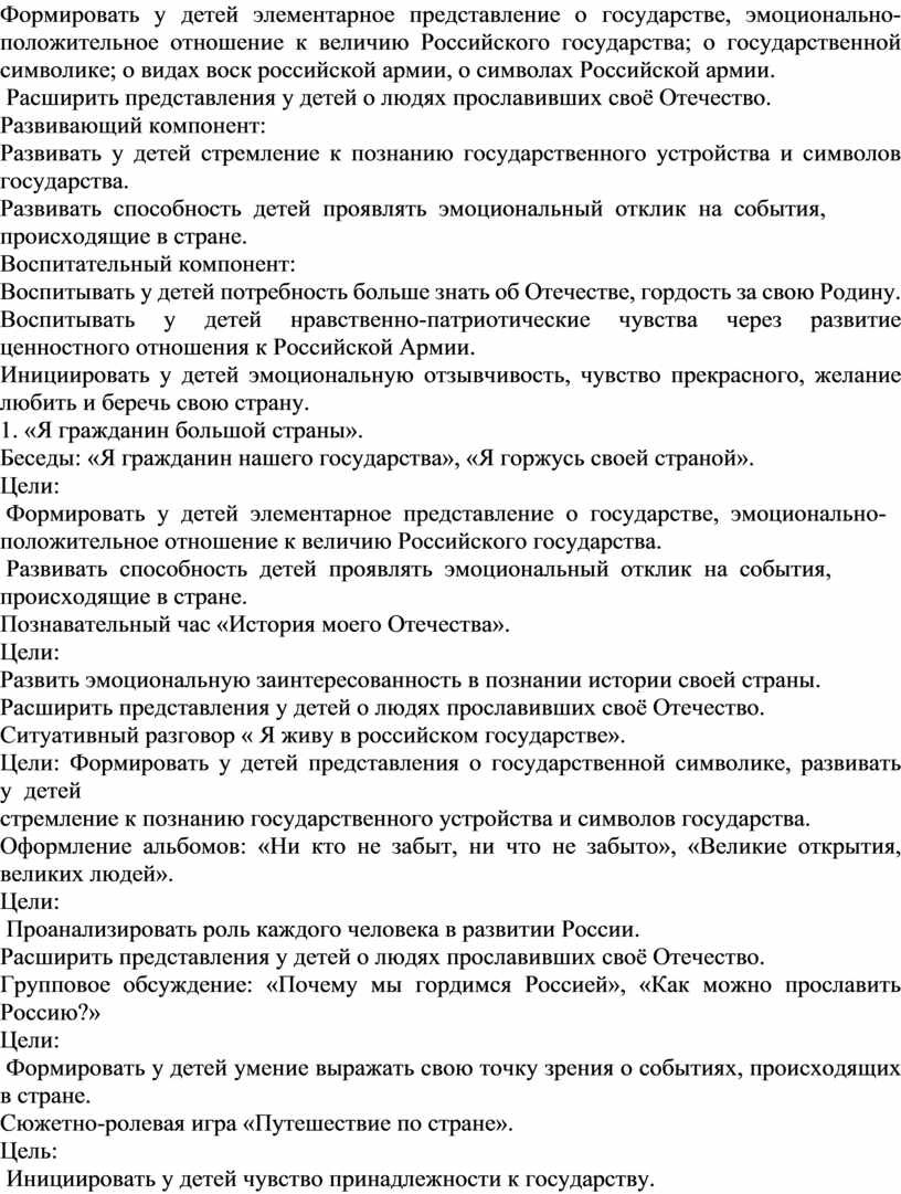 Формировать у детей элементарное представление о государстве, эмоционально- положительное отношение к величию Российского государства; о государственной символике; о видах воск российской армии, о символах Российской армии.