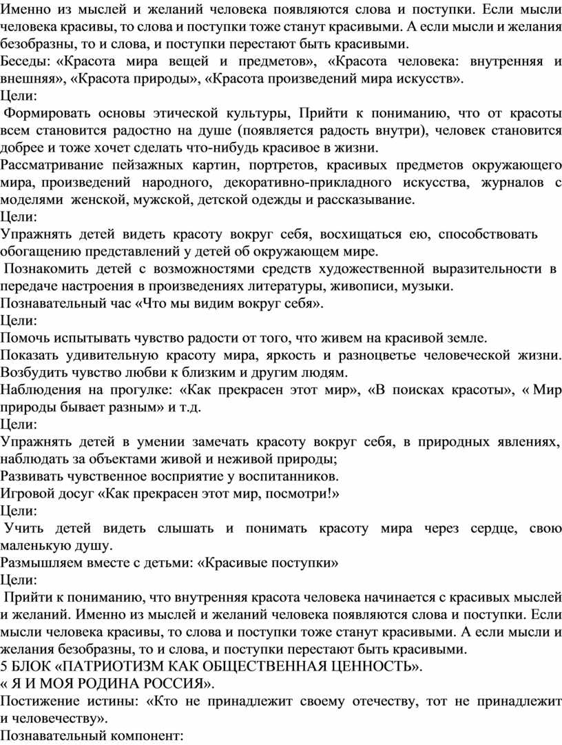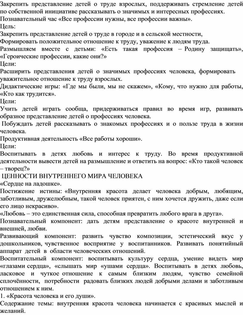 4 раздел - ценности внутреннего мира человека. Здесь представлена тематическая неделя «Сердце на ладошке», которая нашла отражение в под темах «Красота человека и его души», «Сила любви». Все предложенные формы в работе с детьми, направлены на развитие понятийного аппарата детей в области человеческих отношений, на воспитание в детях культуры сердца, умение видеть мир «глазами сердца», «слышать мир «ушами сердца».