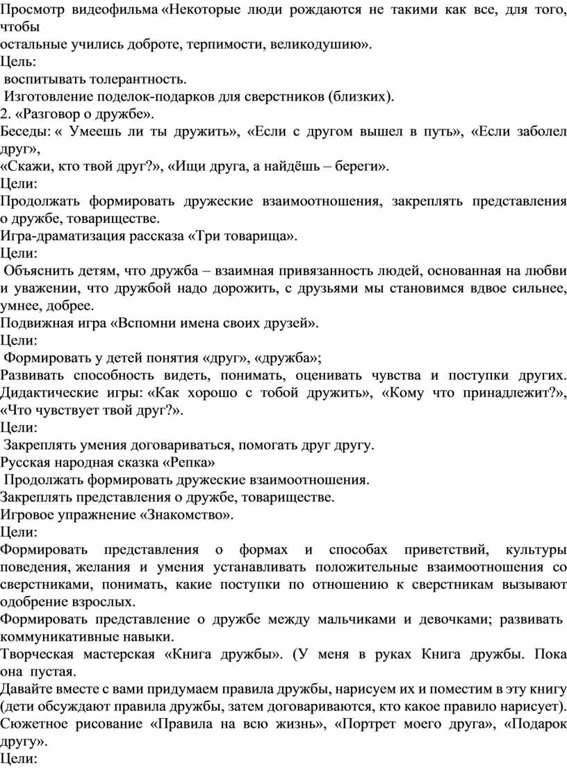 Здесь рассматриваются темы: «Я и мои друзья», «Я и моя семья», где воспитатели объясняют детям, что дружеское отношение зависит от того, как ребята обращаются с другими, что все люди в мире - одна большая семья, подводят детей к понятию: «Относись к другому так, как ты хочешь, чтобы относились к тебе».