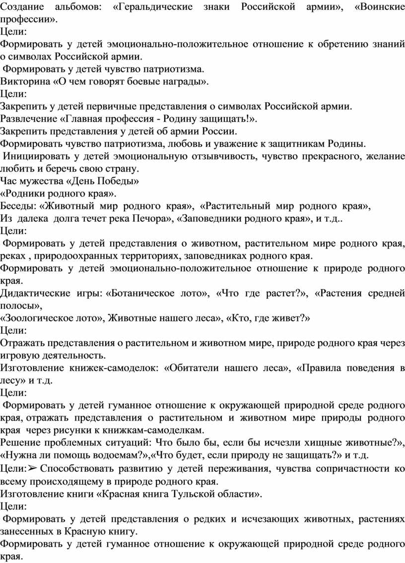 Для работы с детьми представлена тематическая неделя «Я и моя родина Россия», где включены под темы «Я гражданин большой страны», «Наша Армия Сильна», а так же тематическая неделя «Я и мой город» с подразделами «История моего города», «Город помнит своих героев», «Родники родного края» и т.д..