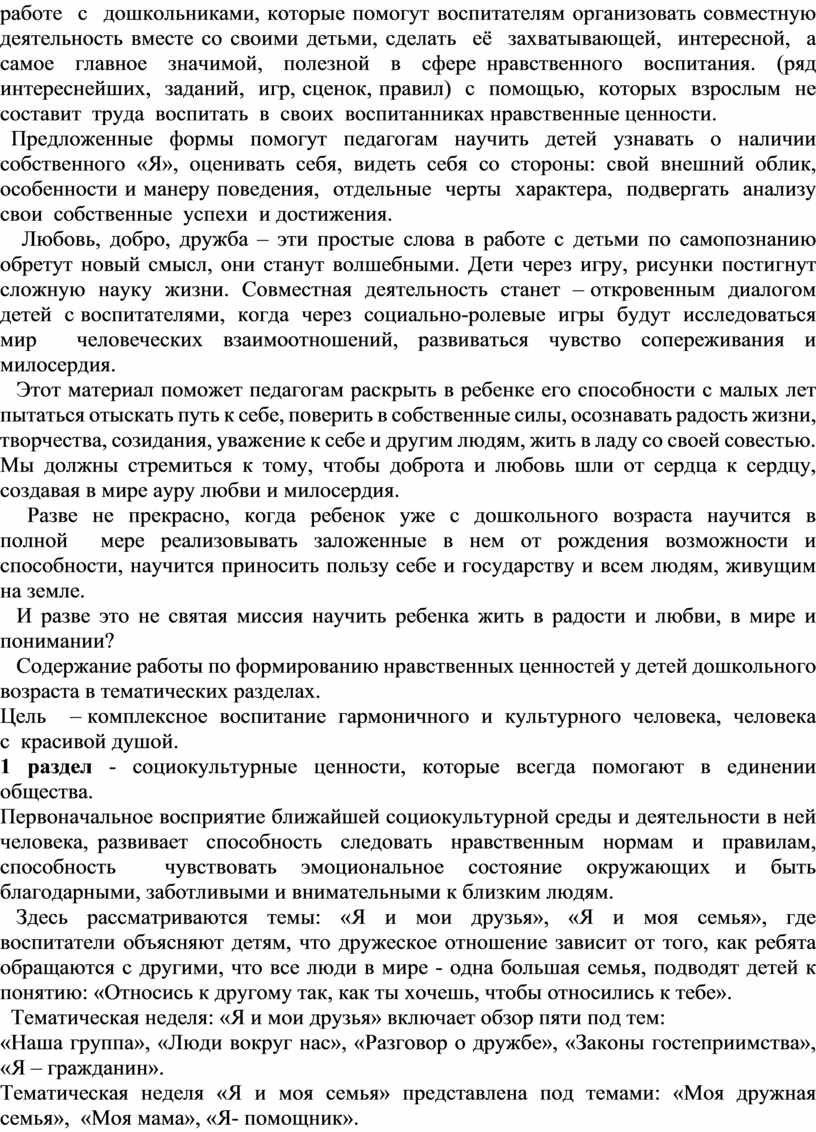 Содержание работы по формированию нравственных ценностей у детей дошкольного возраста в тематических разделах.