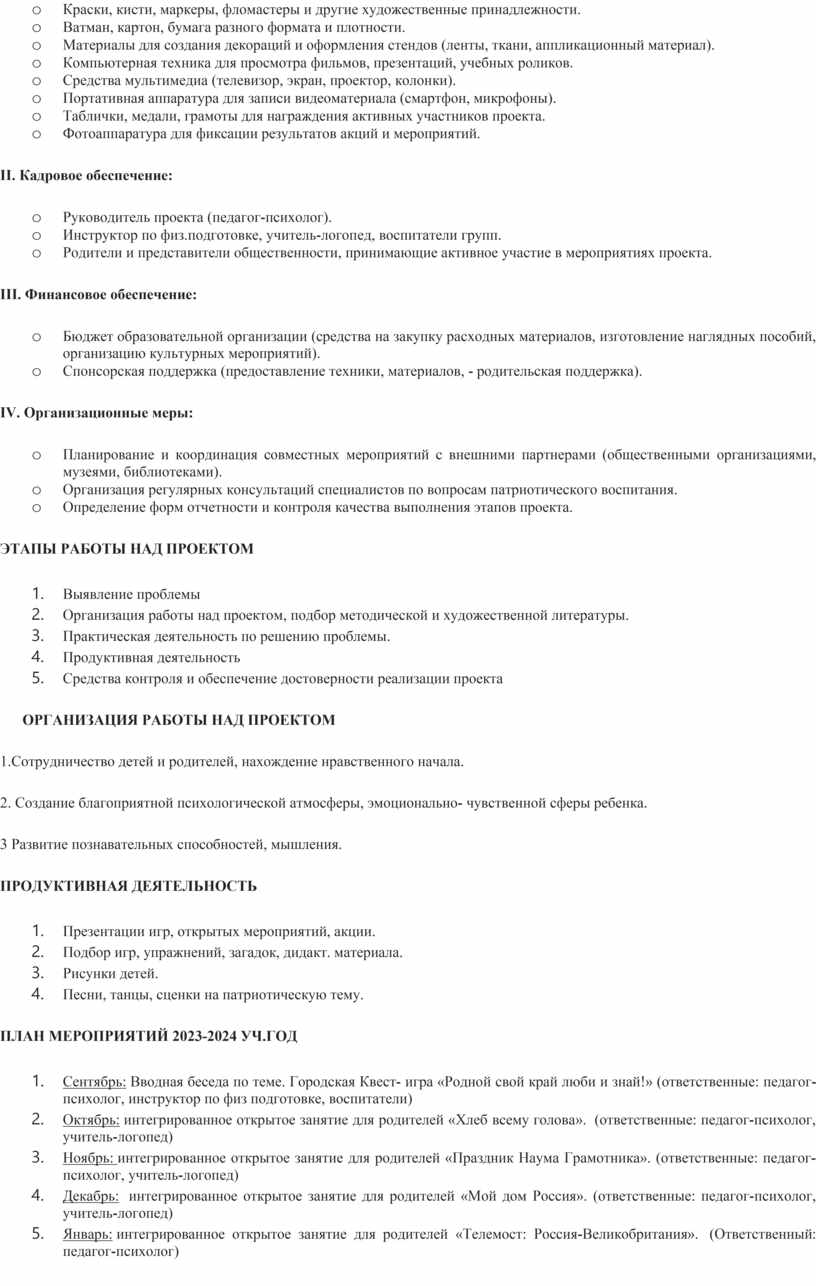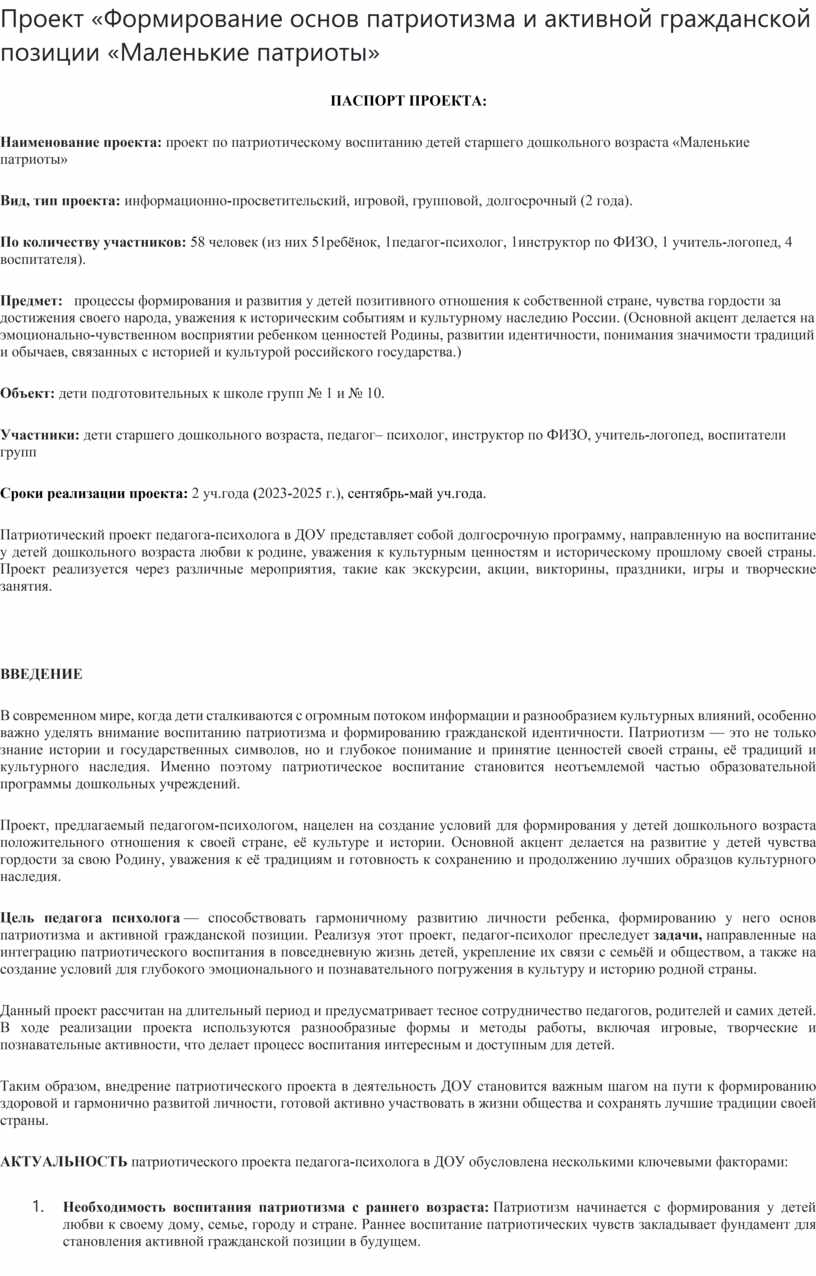 Патриотический проект педагога-психолога в ДОУ представляет собой долгосрочную программу, направленную на воспитание у детей дошкольного возраста любви к родине, уважения к культурным ценностям и историческому прошлому своей страны. Проект реализуется через различные мероприятия, такие как экскурсии, акции, викторины, праздники, игры и творческие занятия.