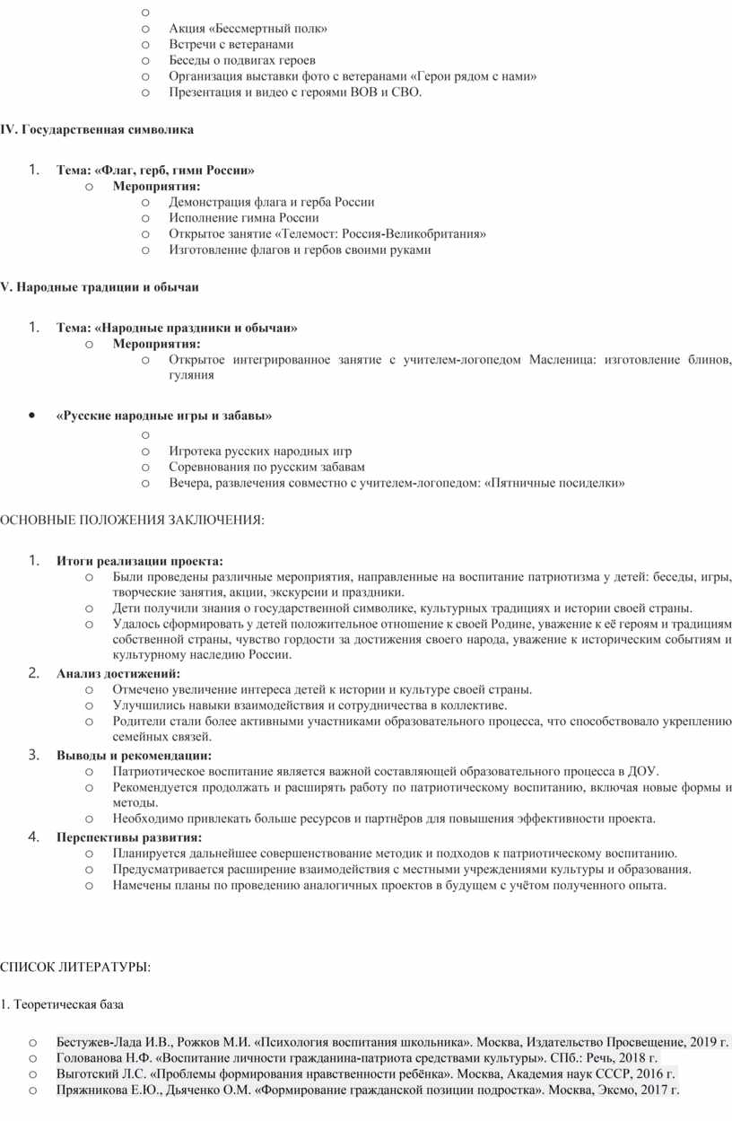 Таким образом, внедрение патриотического проекта в деятельность ДОУ становится важным шагом на пути к формированию здоровой и гармонично развитой личности, готовой активно участвовать в жизни общества и сохранять лучшие традиции своей страны.