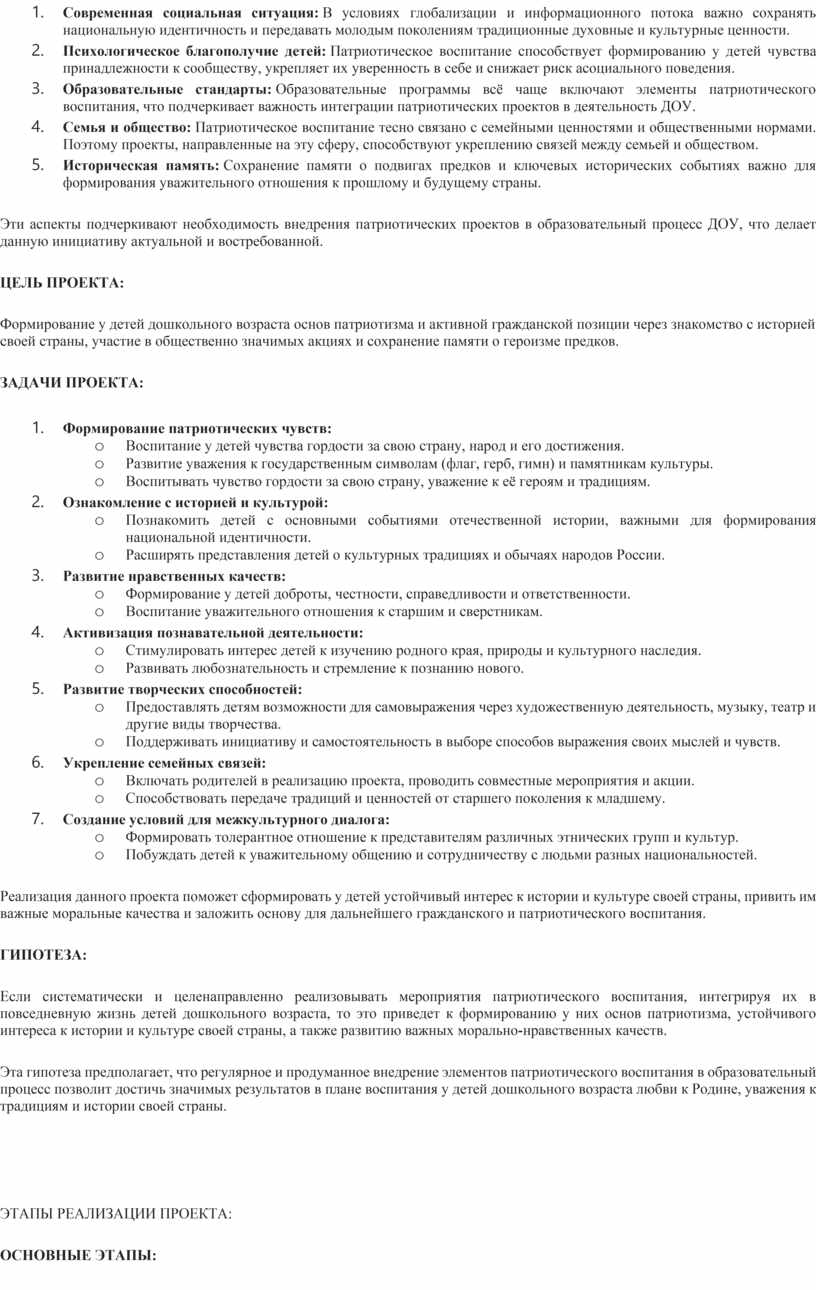 Эти аспекты подчеркивают необходимость внедрения патриотических проектов в образовательный процесс ДОУ, что делает данную инициативу актуальной и востребованной.