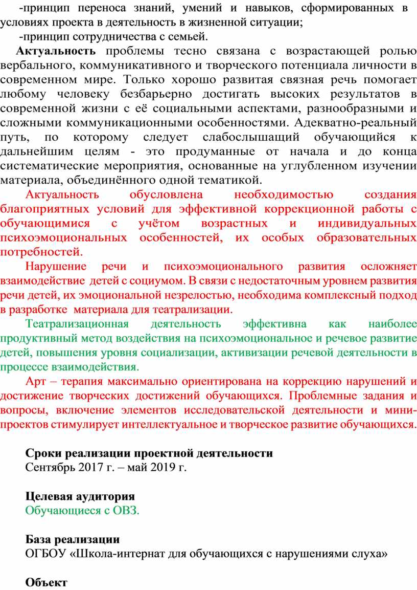 Арт – терапия является эффективным средством коррекции психоэмоционального развития детей, способствует более эмоциональному восприятию текста и позволяет более продуктивно участвовать детям в постановке спектаклей. Театрализация мотивирует детей с ОВЗ к речевому общению и формирует адекватное отношение к своим способностям, придаёт уверенности в себе.