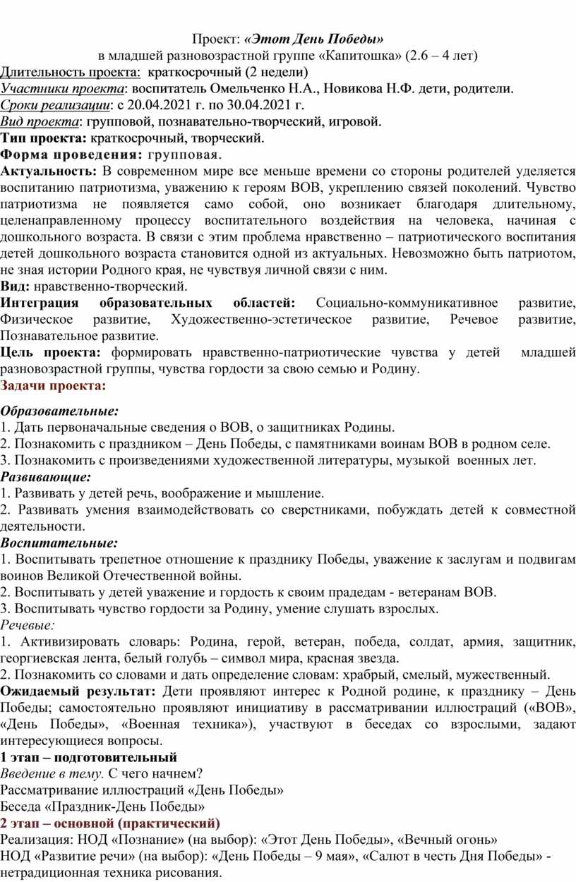 Актуальность: В современном мире все меньше времени со стороны родителей уделяется воспитанию патриотизма, уважению к героям ВОВ, укреплению связей поколений. Чувство патриотизма не появляется само собой, оно возникает благодаря длительному, целенаправленному процессу воспитательного воздействия на человека, начиная с дошкольного возраста. В связи с этим проблема нравственно – патриотического воспитания детей дошкольного возраста становится одной из актуальных. Невозможно быть патриотом, не зная истории Родного края, не чувствуя личной связи с ним.