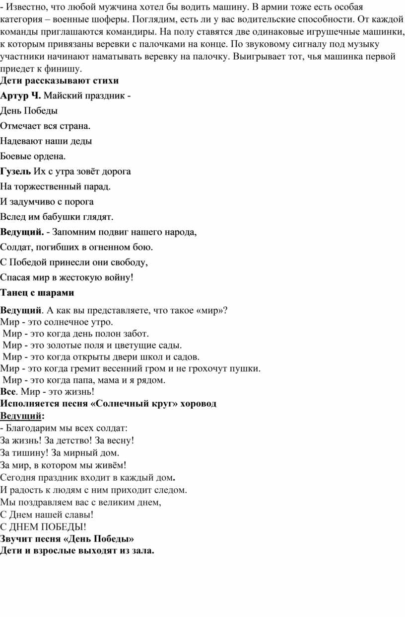 Репертуар: Песня «С днем Победы», «Солнечный круг», Танец «Чтобы не было войны».