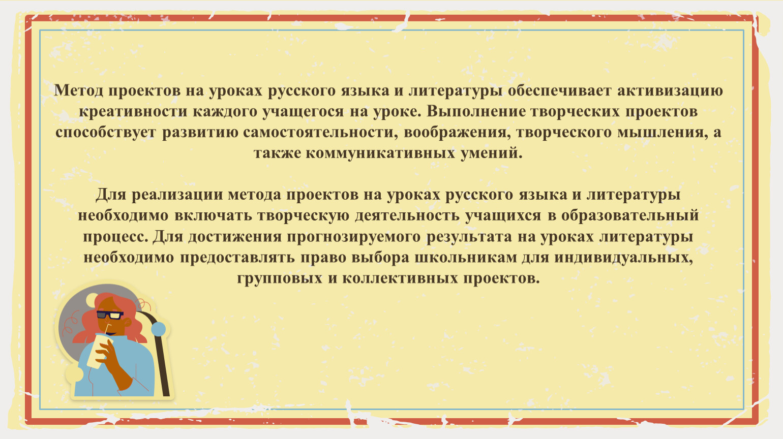 Метод проектов на уроках русского языка и литературы обеспечивает активизацию креативности каждого учащегося на уроке. Выполнение творческих проектов способствует развитию самостоятельности, воображения, творческого мышления, а также коммуникативных умений.