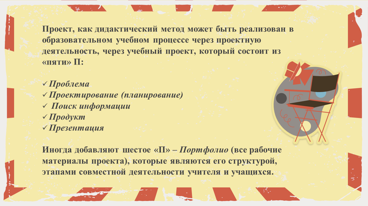Проект, как дидактический метод может быть реализован в образовательном учебном процессе через проектную деятельность, через учебный проект, который состоит из «пяти» П: