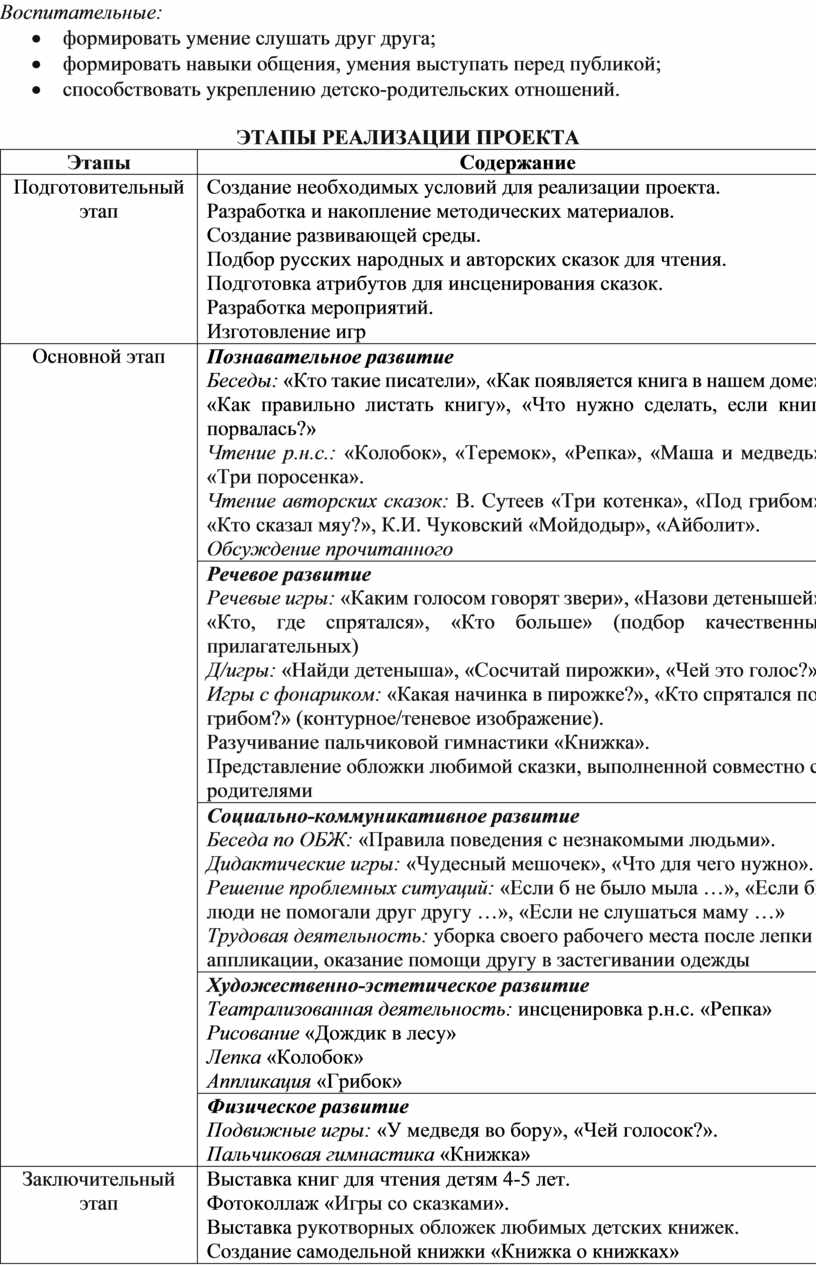 Создание необходимых условий для реализации проекта. Разработка и накопление методических материалов. Создание развивающей среды. Подбор русских народных и авторских сказок для чтения. Подготовка атрибутов для инсценирования сказок. Разработка мероприятий. Изготовление игр |