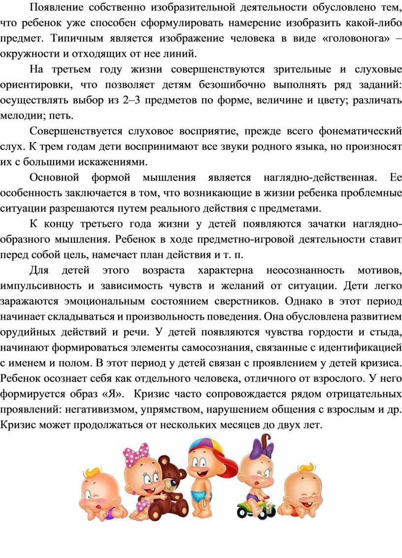 Три года — эго возраст, который можно рассматривать как определенный рубеж развития ребенка с момента его рождения. Кризис трех лет завершает период «слияния» с матерью, малыш все больше начинает осознавать собственную «отдельность». Основные потребности в этом возрасте — потребность в общении, уважении и признании. Основной и самый важный для ребенка вид деятельности — игра.