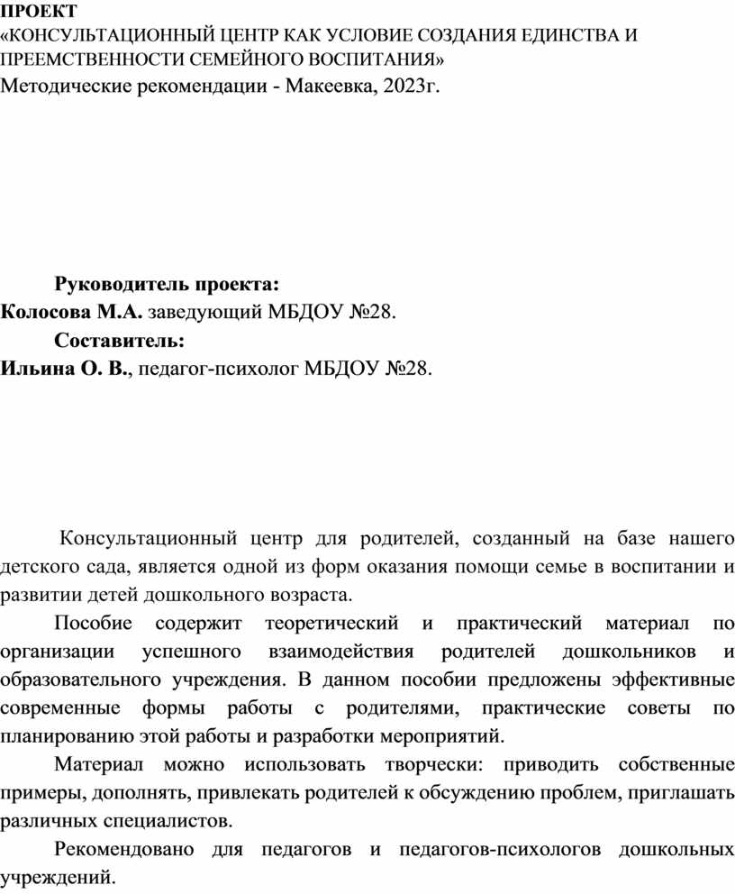 Для всестороннего развития ребенка необходимо взаимодействие семьи и дошкольного учреждения. Ситуация в нашем регионе складывается так, что родители остались один на один со своими проблемами в вопросах воспитания, обучения и развития детей. С целью оказания информационной, психологической, педагогической и консультативной помощи, обеспечения права родителей на уважение и понимание, на участие в жизни детского сада, коллектив МБДОУ №28 выступил с инициативой создания единого консультационного центра.