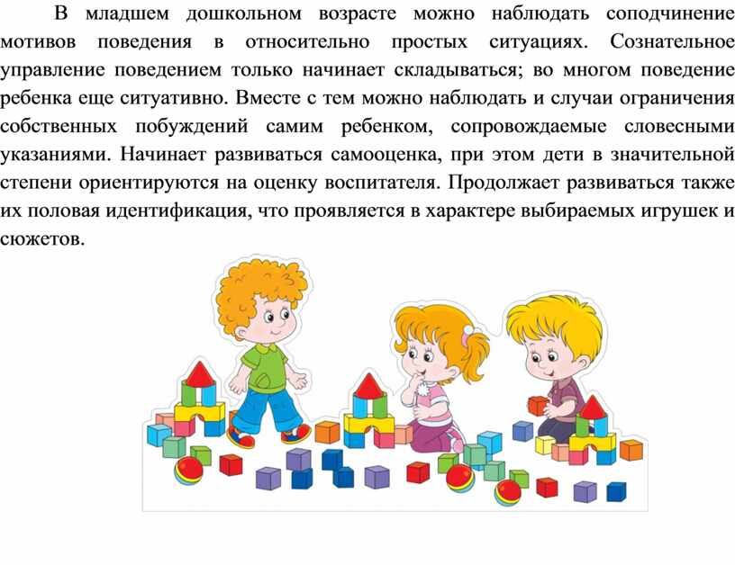 В младшем дошкольном возрасте можно наблюдать соподчинение мотивов поведения в относительно простых ситуациях. Сознательное управление поведением только начинает складываться; во многом поведение ребенка еще ситуативно. Вместе с тем можно наблюдать и случаи ограничения собственных побуждений самим ребенком, сопровождаемые словесными указаниями. Начинает развиваться самооценка, при этом дети в значительной степени ориентируются на оценку воспитателя. Продолжает развиваться также их половая идентификация, что проявляется в характере выбираемых игрушек и сюжетов.