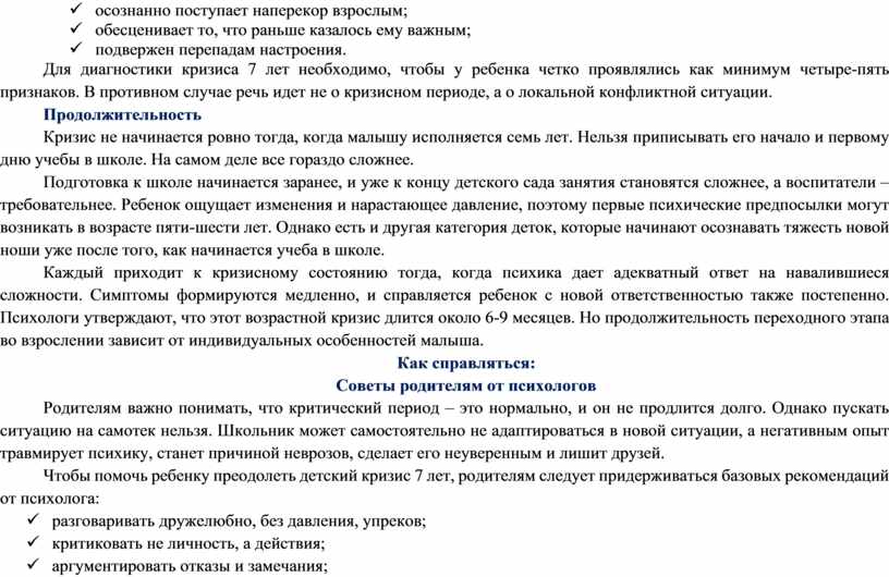 Для диагностики кризиса 7 лет необходимо, чтобы у ребенка четко проявлялись как минимум четыре-пять признаков. В противном случае речь идет не о кризисном периоде, а о локальной конфликтной ситуации.