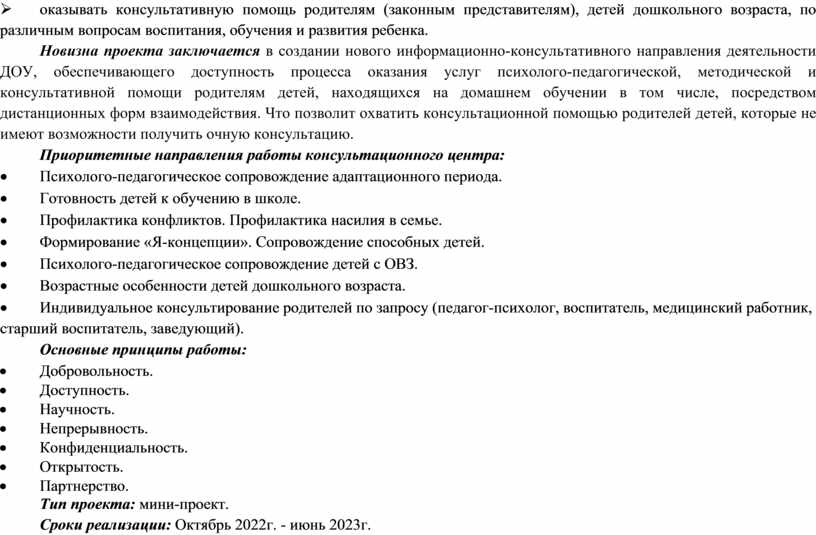 Новизна проекта заключается в создании нового информационно-консультативного направления деятельности ДОУ, обеспечивающего доступность процесса оказания услуг психолого-педагогической, методической и консультативной помощи родителям детей, находящихся на домашнем обучении в том числе, посредством дистанционных форм взаимодействия. Что позволит охватить консультационной помощью родителей детей, которые не имеют возможности получить очную консультацию.