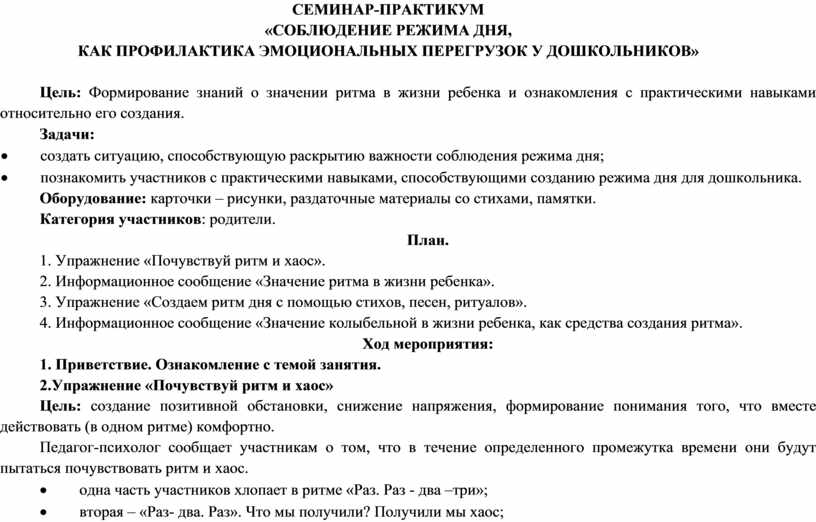 Семинар-практикум. Соблюдение режима дня, как профилактика эмоциональных перегрузок у дошкольников |
