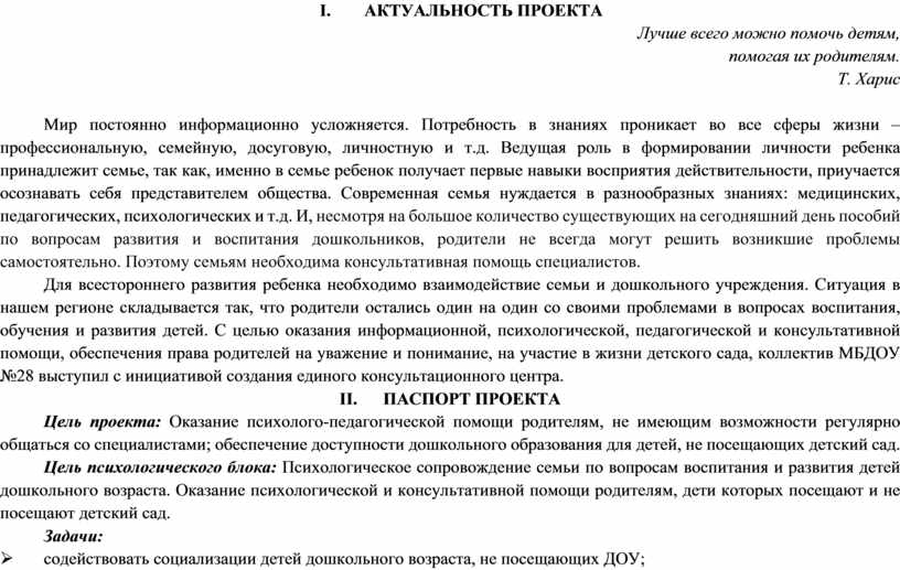 Мир постоянно информационно усложняется. Потребность в знаниях проникает во все сферы жизни – профессиональную, семейную, досуговую, личностную и т.д. Ведущая роль в формировании личности ребенка принадлежит семье, так как, именно в семье ребенок получает первые навыки восприятия действительности, приучается осознавать себя представителем общества. Современная семья нуждается в разнообразных знаниях: медицинских, педагогических, психологических и т.д. И, несмотря на большое количество существующих на сегодняшний день пособий по вопросам развития и воспитания дошкольников, родители не всегда могут решить возникшие проблемы самостоятельно. Поэтому семьям необходима консультативная помощь специалистов.