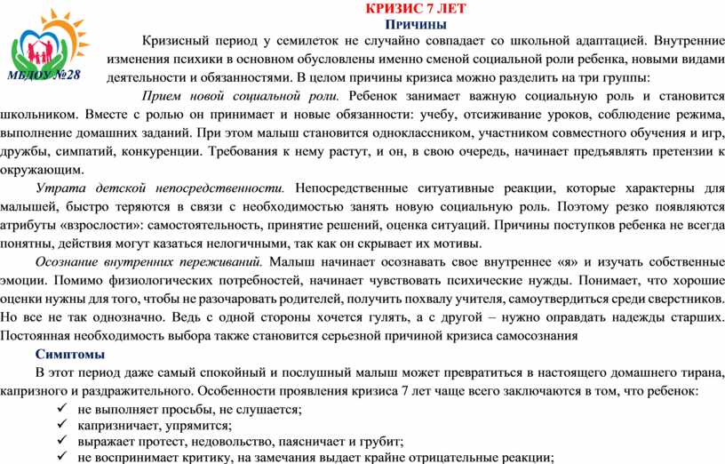 Кризисный период у семилеток не случайно совпадает со школьной адаптацией. Внутренние изменения психики в основном обусловлены именно сменой социальной роли ребенка, новыми видами деятельности и обязанностями. В целом причины кризиса можно разделить на три группы: