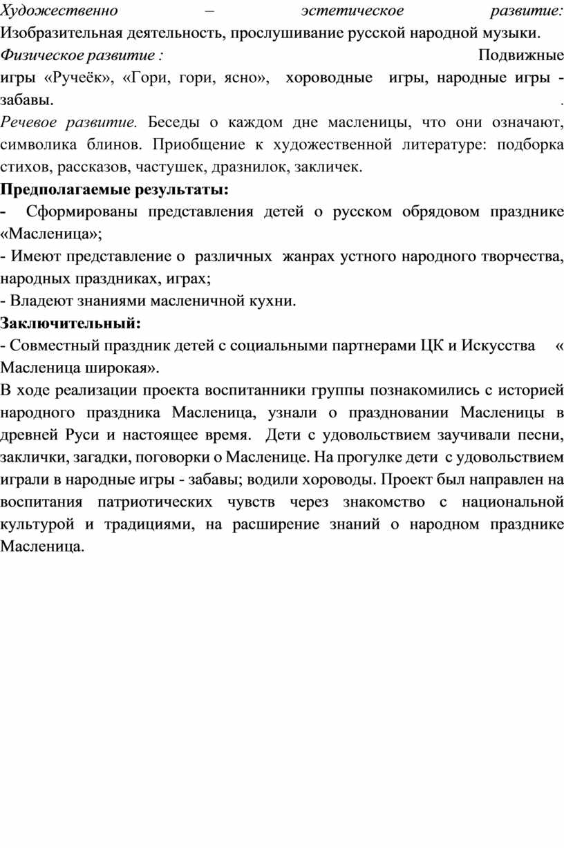 Масленица – один из ярких и веселых народных праздников, происходящий в конце зимы, всегда отмечался, шумно с блинами, ярмарками и скоморохами. Поэтому этот праздник оставляет светлые впечатления, прививая интерес к историческому прошлому страны. В результате реализации этого проекта дети знакомятся с национальной культурой и народными традициями, приобретают знания о смене сезонов, узнают новые народные песни, сказки, пляски, игры. У детей формируется познавательный интерес, воспитывается эмоциональное, положительное отношение к традициям русского народа.