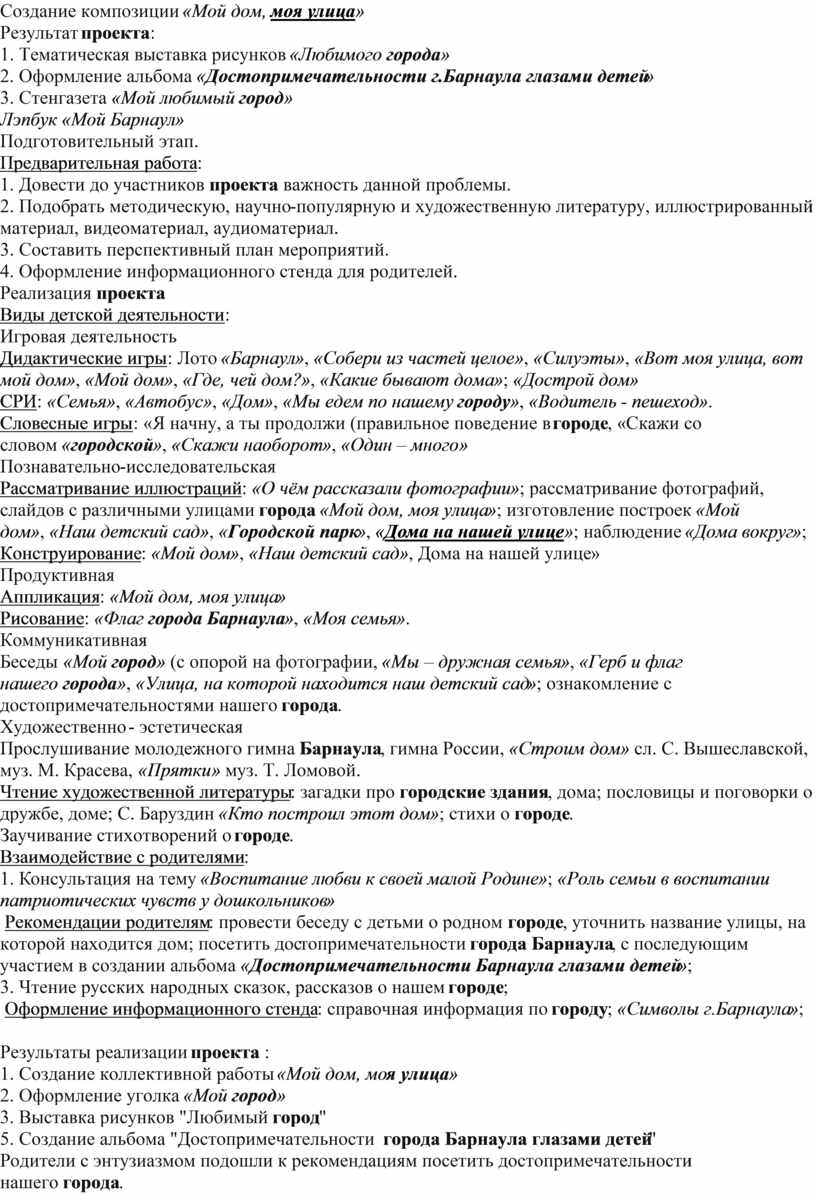 2. Рекомендации родителям: провести беседу с детьми о родном городе, уточнить название улицы, на которой находится дом; посетить достопримечательности города Барнаула, с последующим участием в создании альбома «Достопримечательности Барнаула глазами детей»;