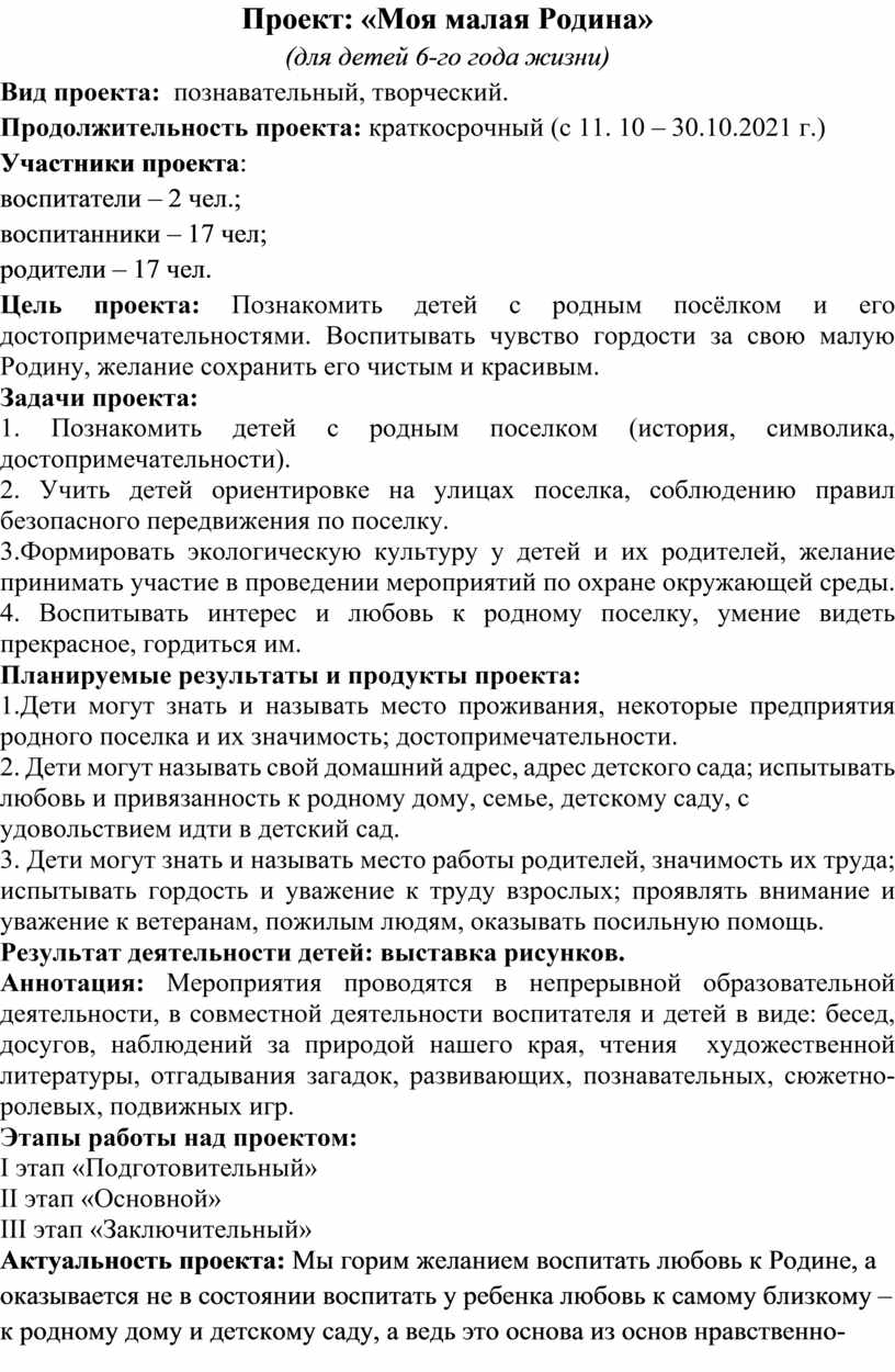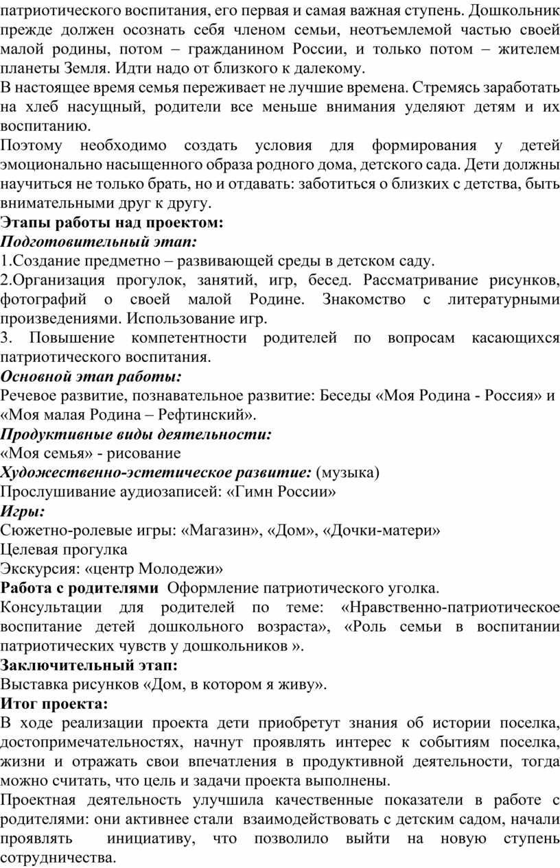 Актуальность проекта: Мы горим желанием воспитать любовь к Родине, а оказывается не в состоянии воспитать у ребенка любовь к самому близкому – к родному дому и детскому саду, а ведь это основа из основ нравственно-патриотического воспитания, его первая и самая важная ступень. Дошкольник прежде должен осознать себя членом семьи, неотъемлемой частью своей малой родины, потом – гражданином России, и только потом – жителем планеты Земля. Идти надо от близкого к далекому.
