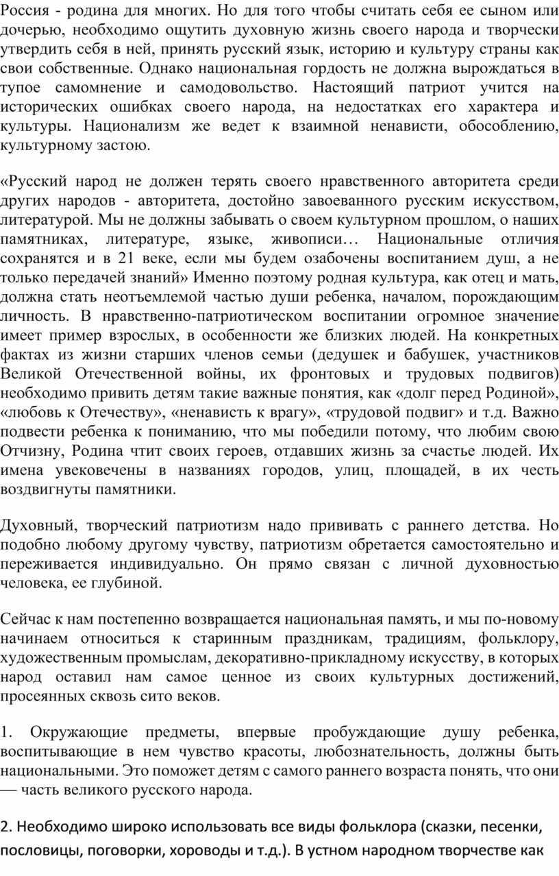 «Русский народ не должен терять своего нравственного авторитета среди других народов - авторитета, достойно завоеванного русским искусством, литературой. Мы не должны забывать о своем культурном прошлом, о наших памятниках, литературе, языке, живописи… Национальные отличия сохранятся и в 21 веке, если мы будем озабочены воспитанием душ, а не только передачей знаний» Именно поэтому родная культура, как отец и мать, должна стать неотъемлемой частью души ребенка, началом, порождающим личность. В нравственно-патриотическом воспитании огромное значение имеет пример взрослых, в особенности же близких людей. На конкретных фактах из жизни старших членов семьи (дедушек и бабушек, участников Великой Отечественной войны, их фронтовых и трудовых подвигов) необходимо привить детям такие важные понятия, как «долг перед Родиной», «любовь к Отечеству», «ненависть к врагу», «трудовой подвиг» и т.д. Важно подвести ребенка к пониманию, что мы победили потому, что любим свою Отчизну, Родина чтит своих героев, отдавших жизнь за счастье людей. Их имена увековечены в названиях городов, улиц, площадей, в их честь воздвигнуты памятники.