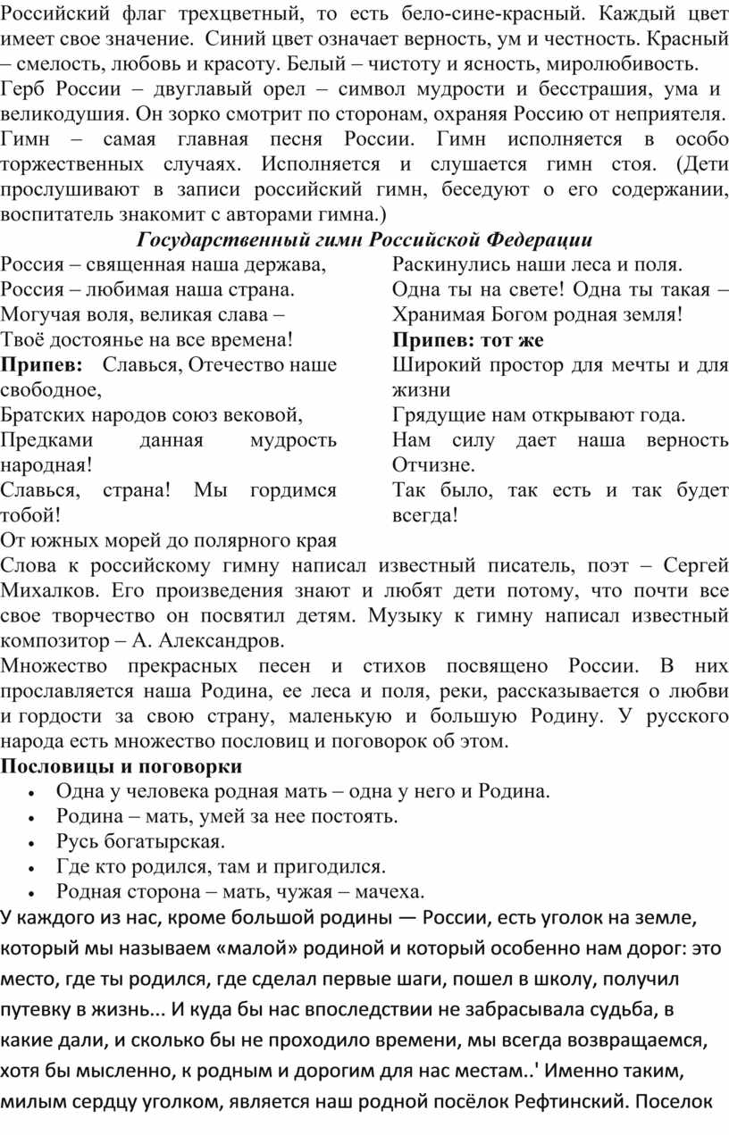 Гимн – самая главная песня России. Гимн исполняется в особо торжественных случаях. Исполняется и слушается гимн стоя. (Дети прослушивают в записи российский гимн, беседуют о его содержании, воспитатель знакомит с авторами гимна.)