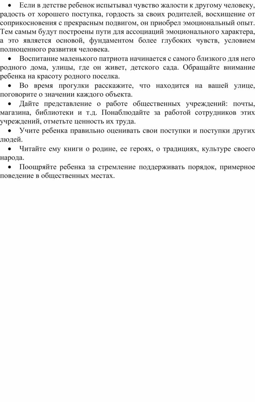· Воспитание маленького патриота начинается с самого близкого для него родного дома, улицы, где он живет, детского сада. Обращайте внимание ребенка на красоту родного поселка.