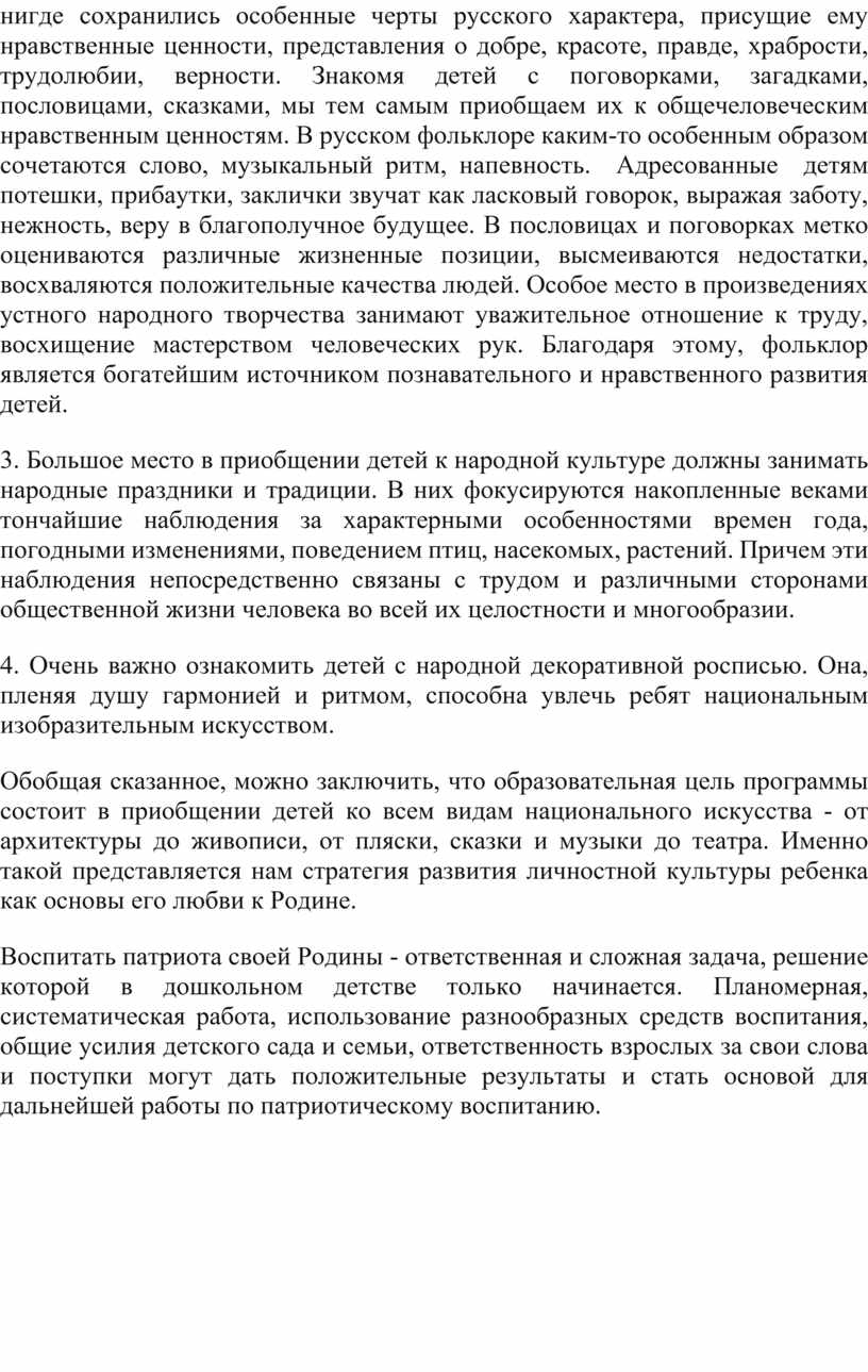 Обобщая сказанное, можно заключить, что образовательная цель программы состоит в приобщении детей ко всем видам национального искусства - от архитектуры до живописи, от пляски, сказки и музыки до театра. Именно такой представляется нам стратегия развития личностной культуры ребенка как основы его любви к Родине.