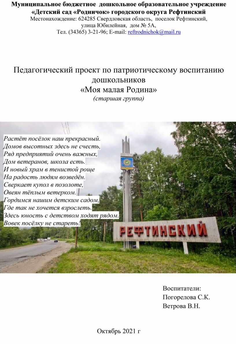 У каждого из нас, кроме большой родины — России, есть уголок на земле, который мы называем «малой» родиной и который особенно нам дорог: это место, где ты родился, где сделал первые шаги, пошел в школу, получил путевку в жизнь... И куда бы нас впоследствии не забрасывала судьба, в какие дали, и сколько бы не проходило времени, мы всегда возвращаемся, хотя бы мысленно, к родным и дорогим для нас местам..' Именно таким, милым сердцу уголком, является наш родной посёлок Рефтинский. Поселок находится в Свердловской области. Столица Свердл.обл. – город Екатеринбург.