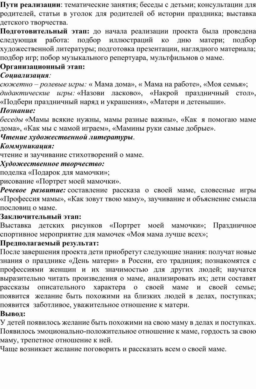 Подготовительный этап: до начала реализации проекта была проведена следующая работа: подбор иллюстраций ко дню матери; подбор художественной литературы; подготовка презентации, наглядного материала;