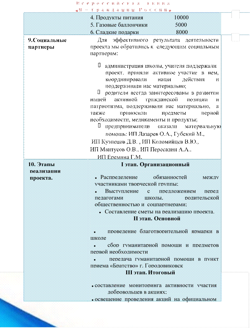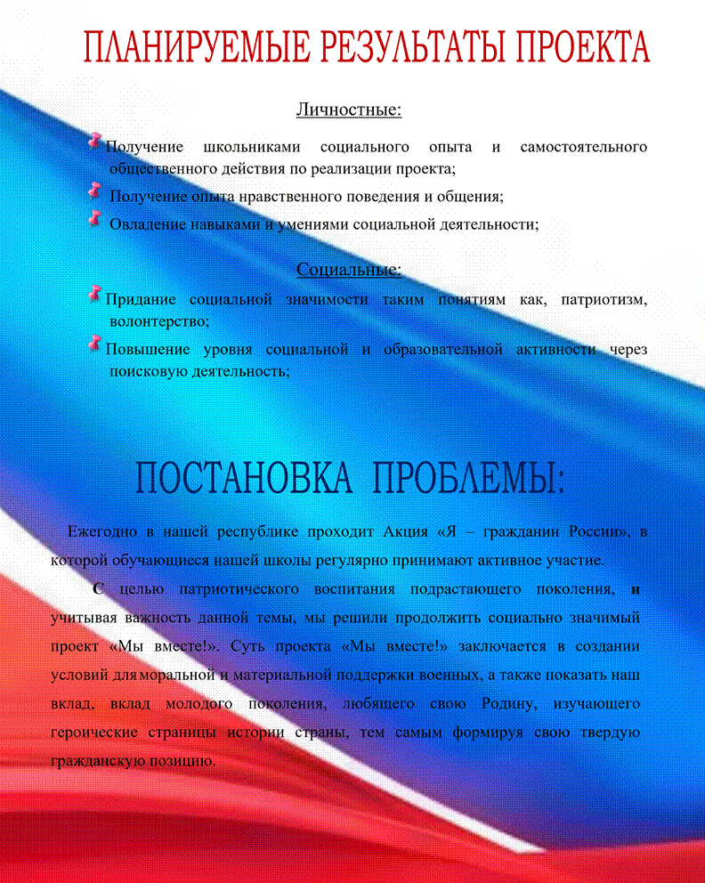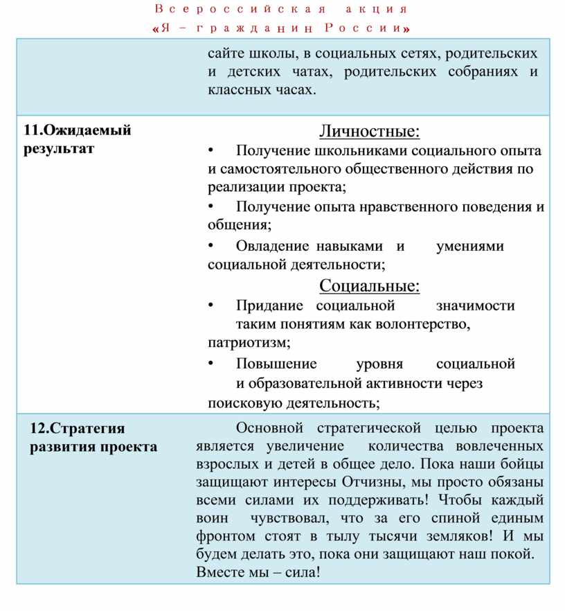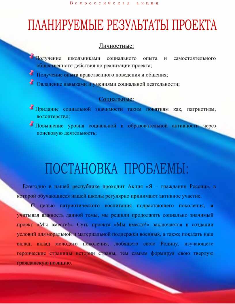 Личностные: • Получение школьниками социального опыта и самостоятельного общественного действия по реализации проекта; • Получение опыта нравственного поведения и общения; • Овладение навыками и умениями социальной деятельности; Социальные: • Придание социальной значимости таким понятиям как волонтерство, патриотизм; • Повышение уровня социальной и образовательной активности через поисковую деятельность; |